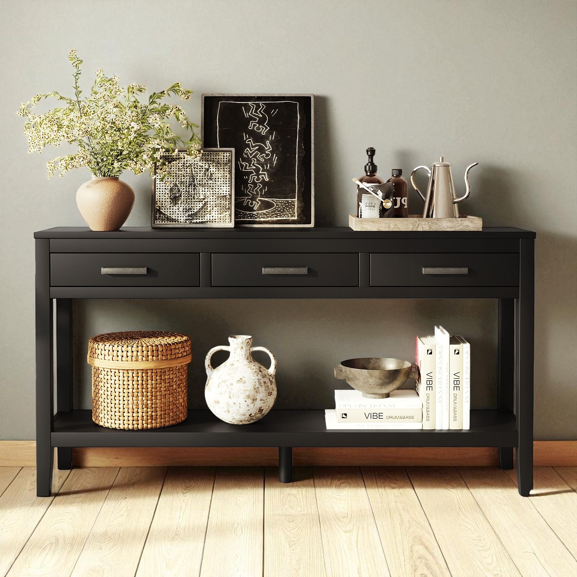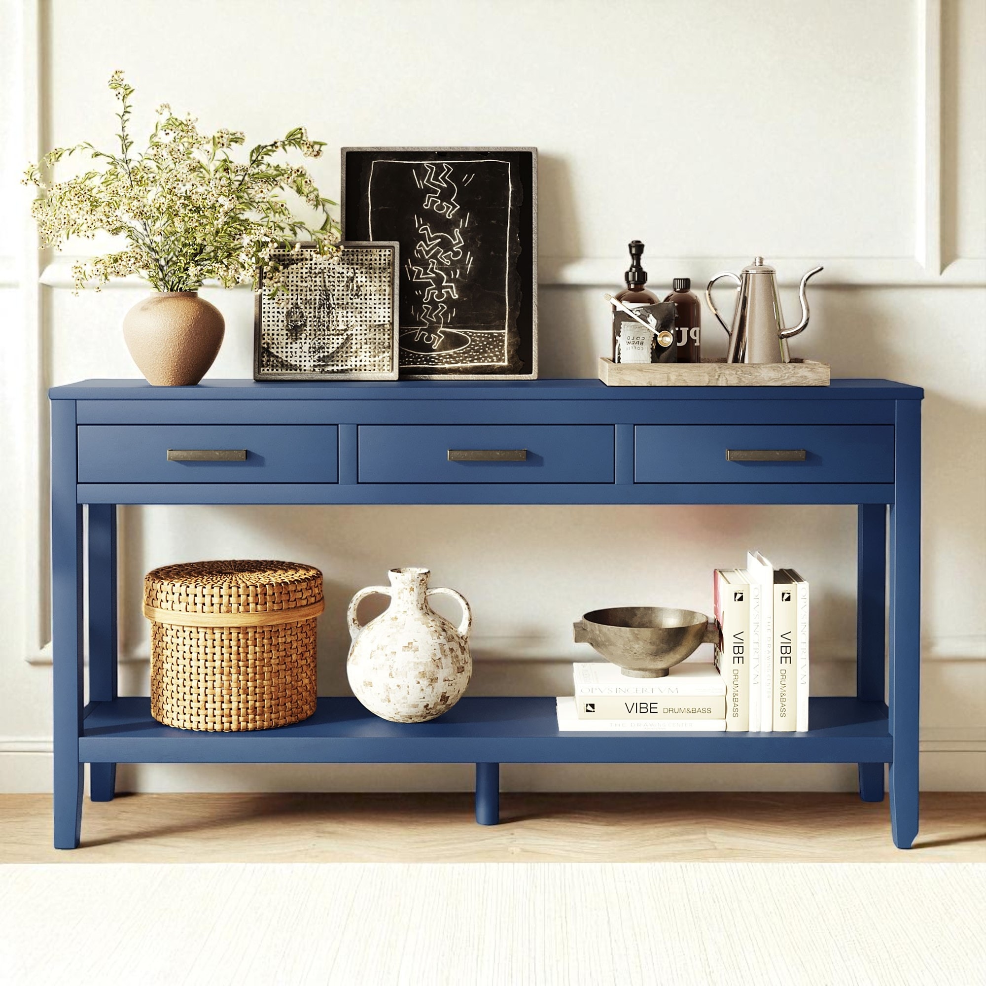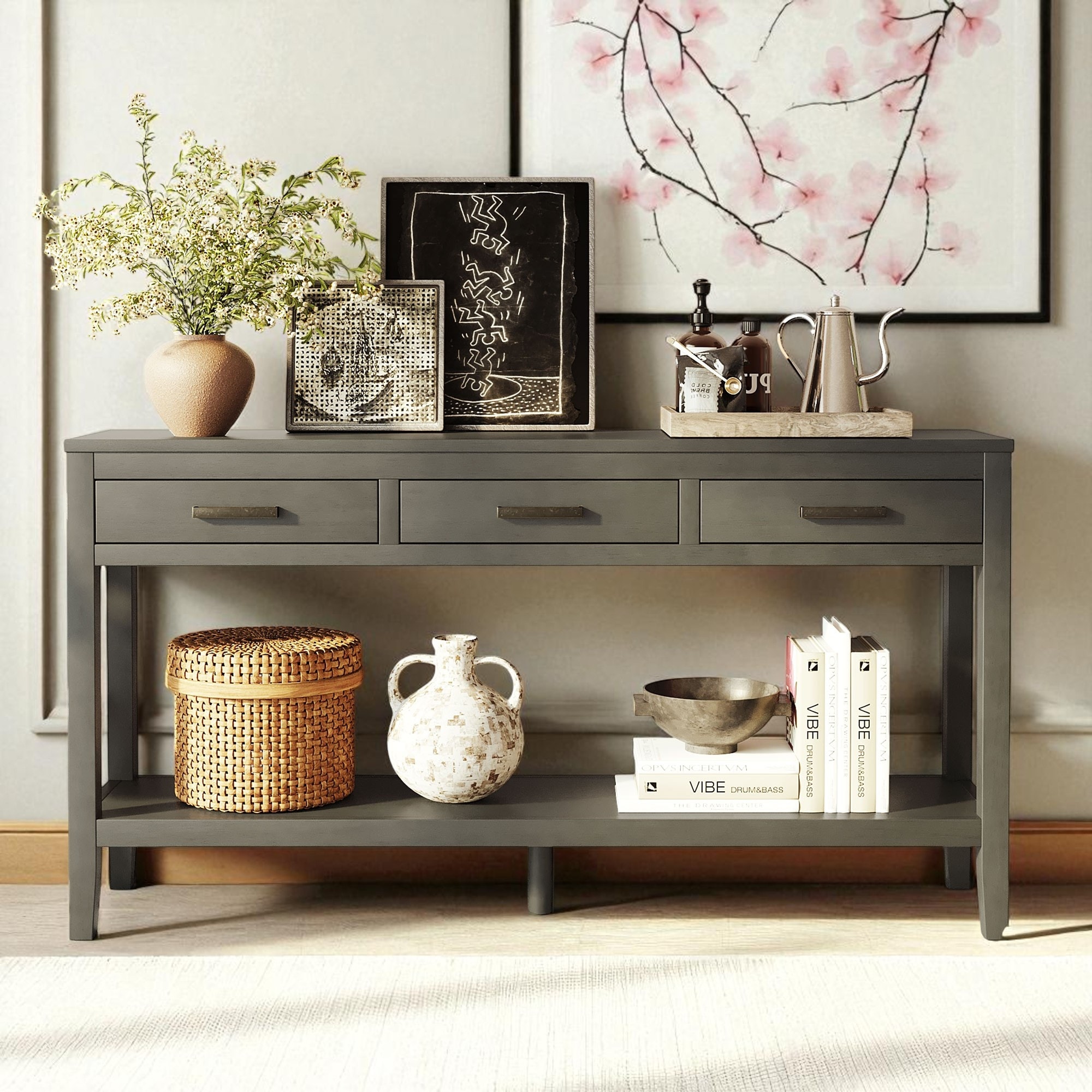 62.2 Inch Farmhouse Console Table with 3 Drawers and Shelf, Entryway Sofa Table with Iron Handles and Adjustable Feet - MDF
