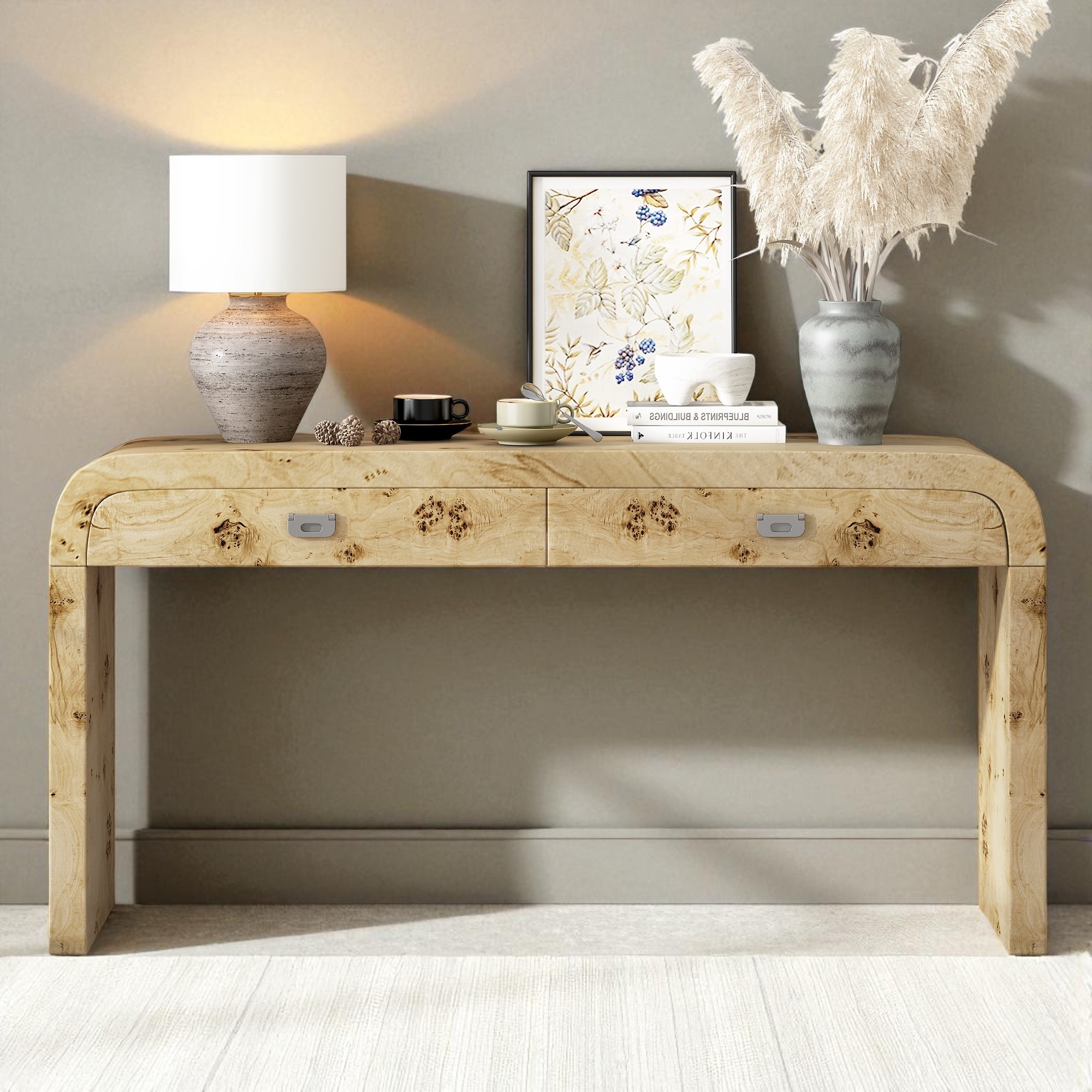 60 Inch Burl Veneer Console Table with 2 Drawers and Zinc Handles, Rectangular Entryway Table for Living Room or Hallway - Wood