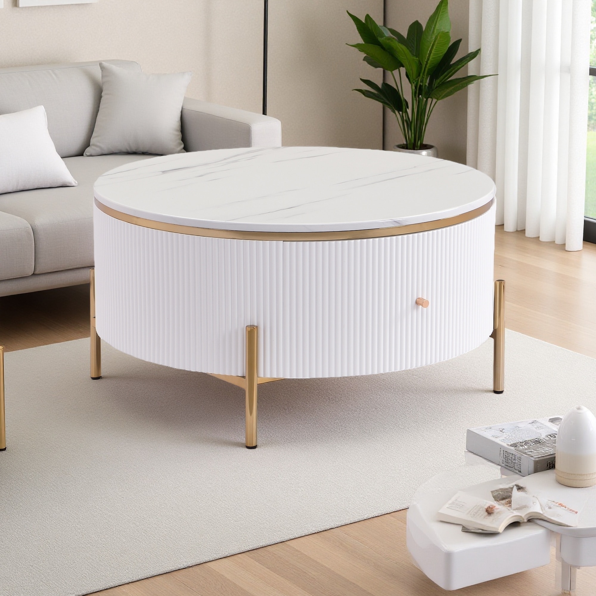 Modern Round Nesting Coffee Table Fluted with Drawer in White & Gold in 27.6"