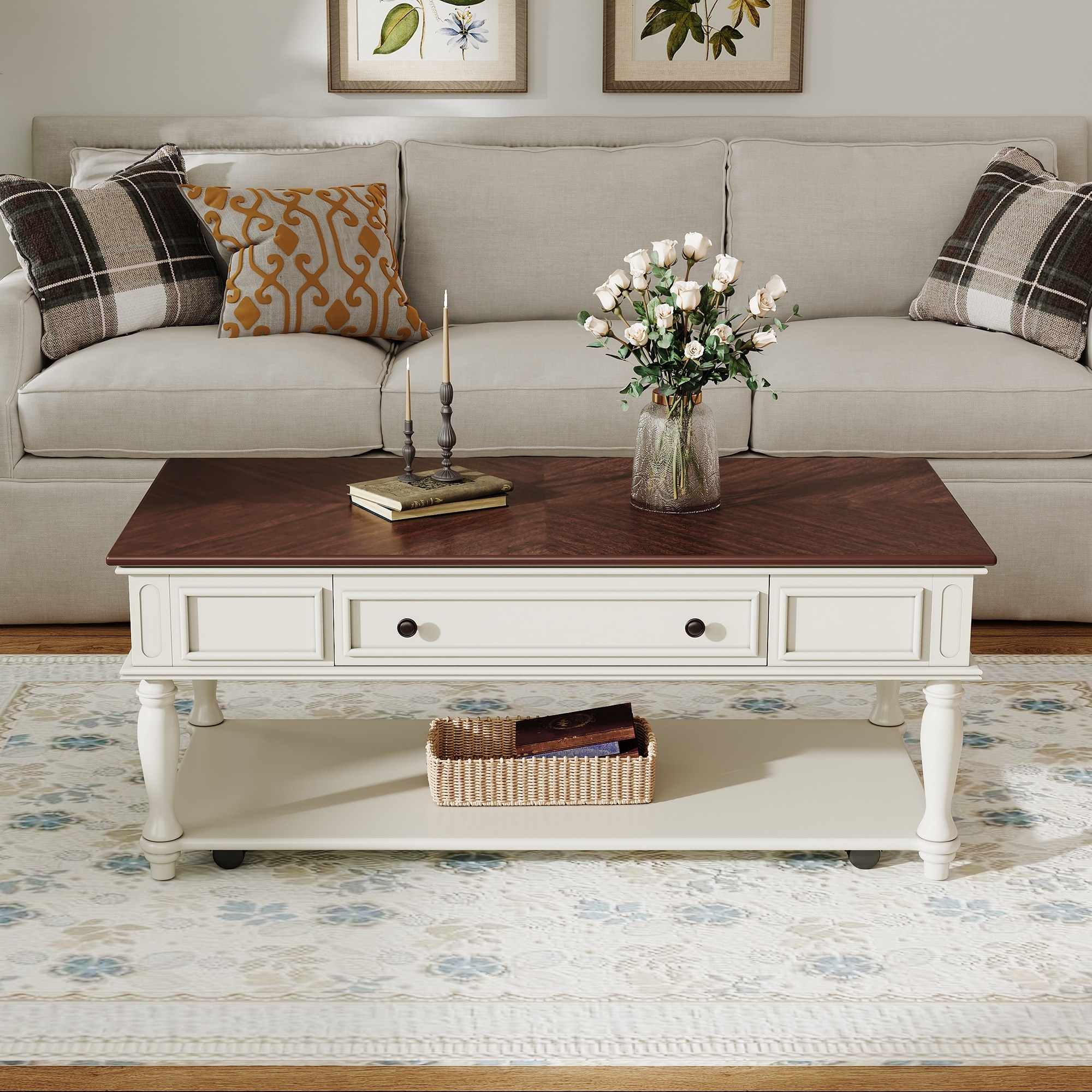 Roomfitters Farmhouse Coffee Table, Retro Wooden Center Table with Drawer, Wheels, and Solid Wood Legs