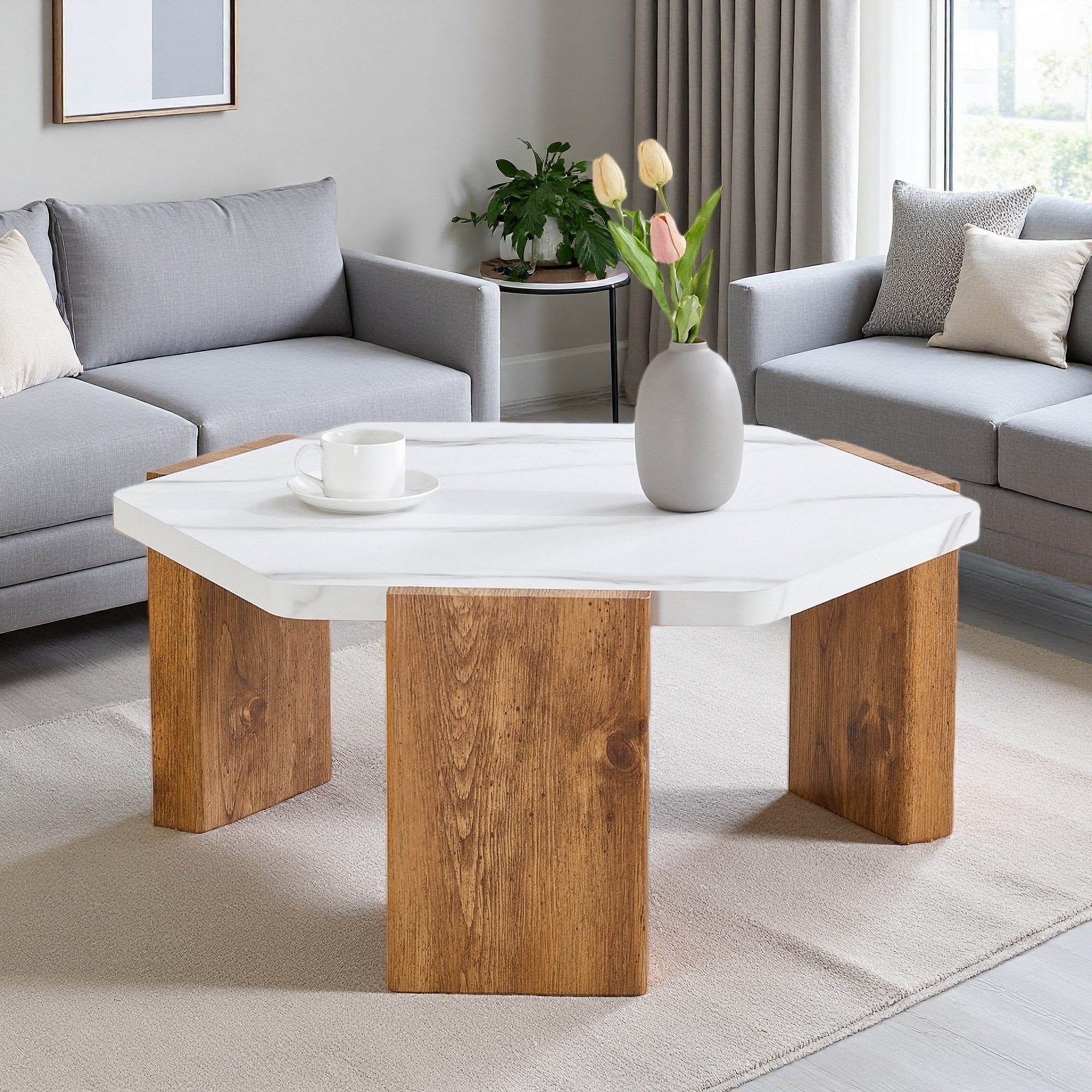 31" Pentagonal MDF Coffee Table with Marble Texture and Triangular Base