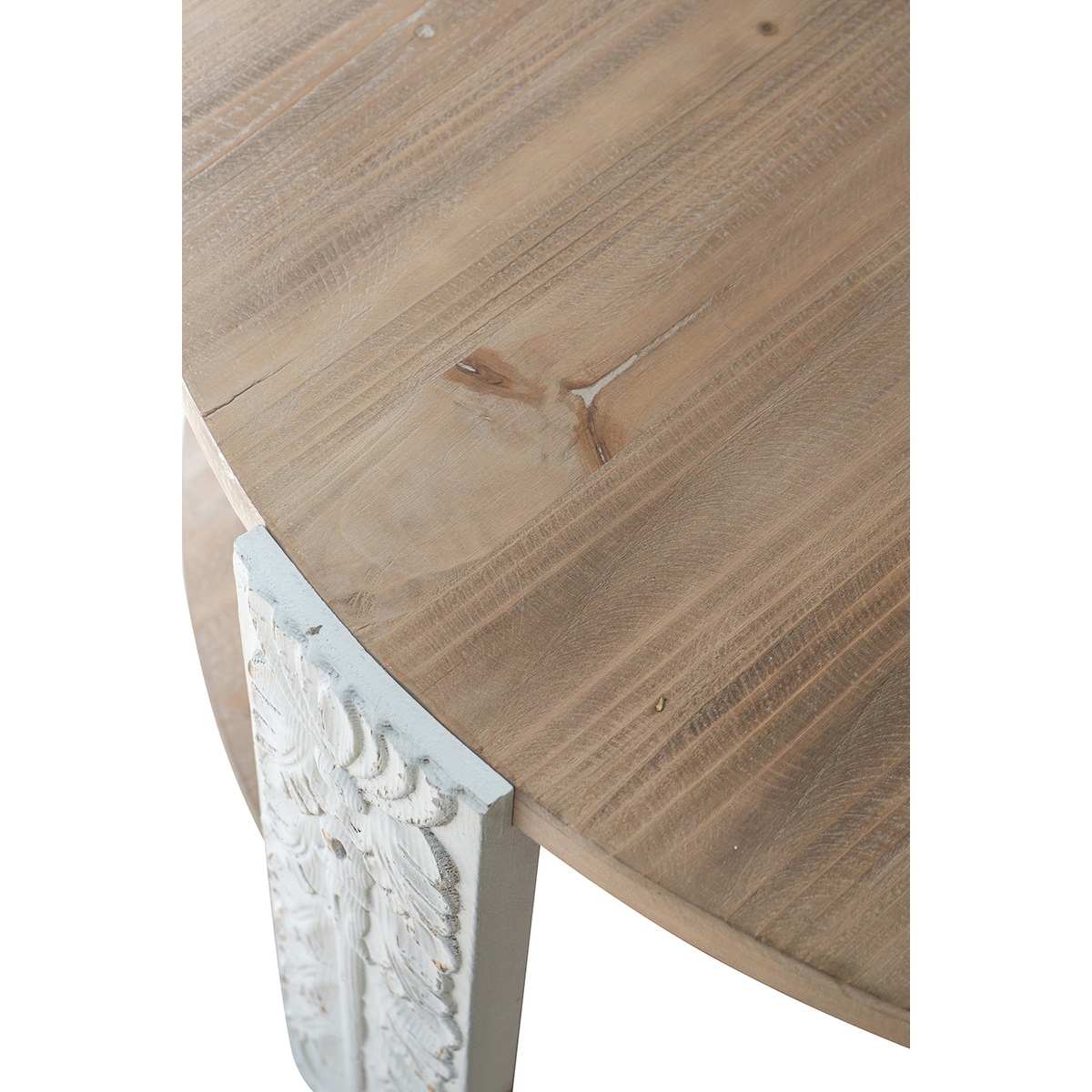 Round Wooden Coffee Table with Natural Brown Finish, Carved White Legs