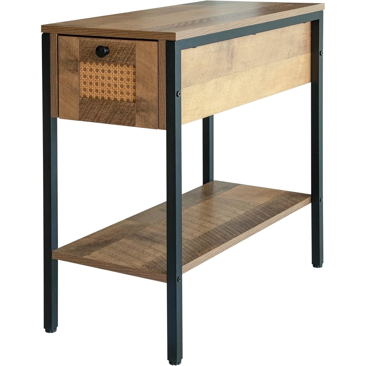 Narrow End Table with Rattan Drawer, Black Metal Frame, Salmon Oak Finish
