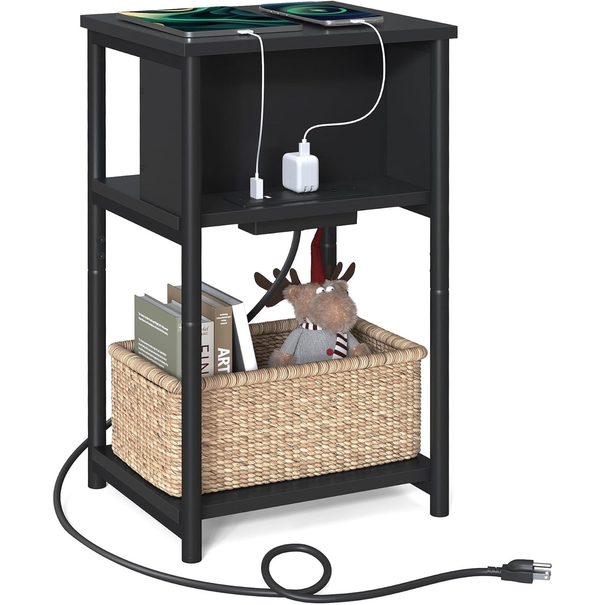 3-Tier Side Table with Charging Station, USB Ports, and AC Outlets for Living Room or Bedroom, Black