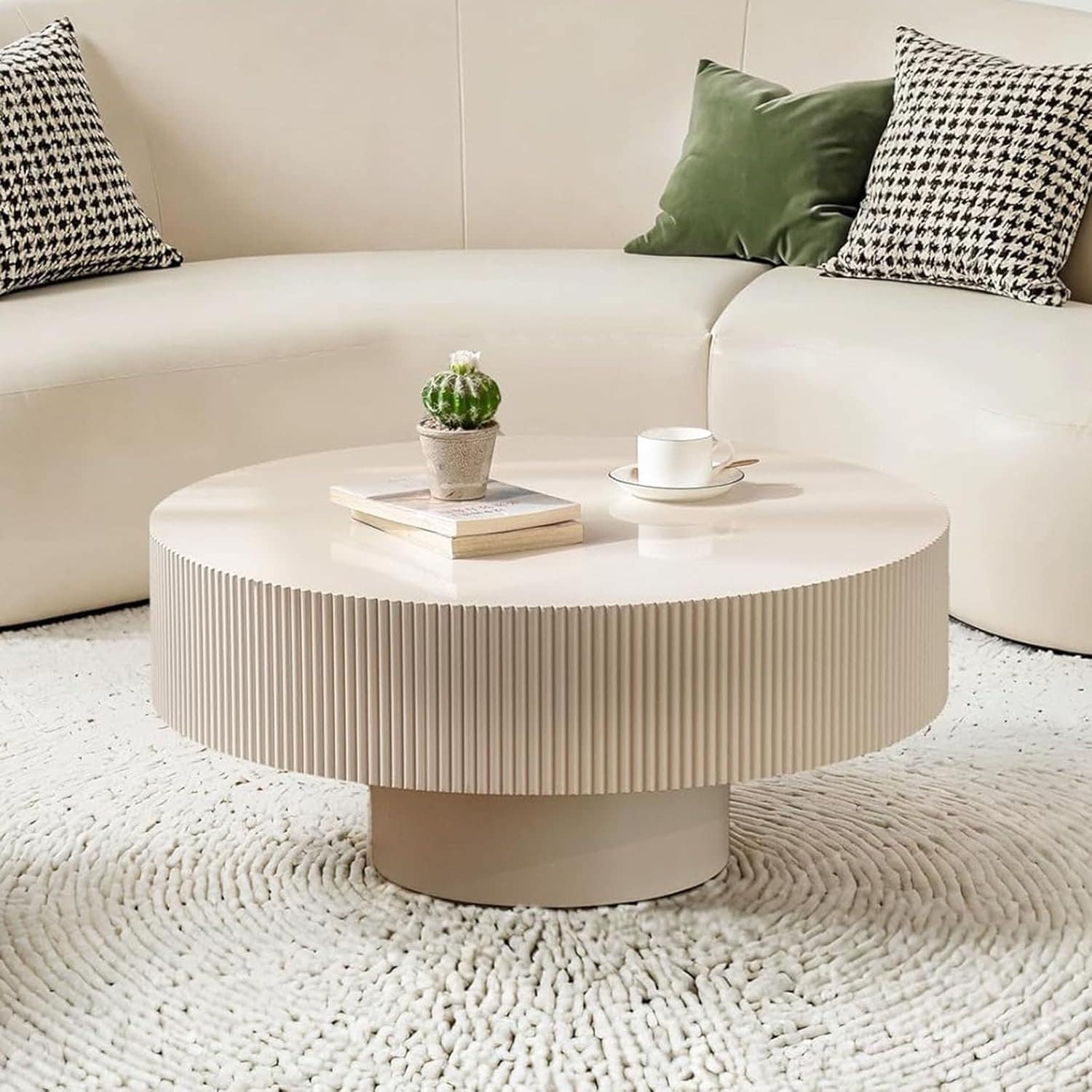 Round Wood Coffee Table with Handcrafted Fluted Design, Sturdy Base