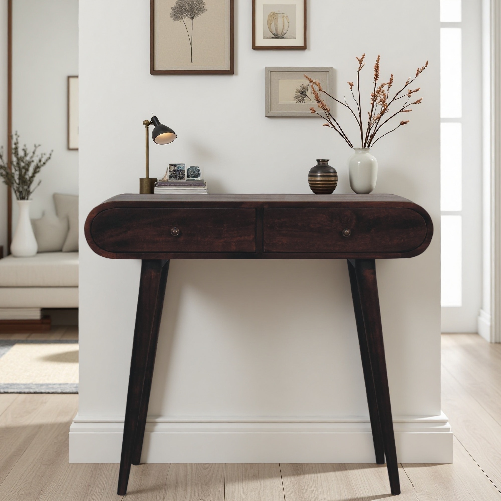 35.43" Solid Mango Wood Light Walnut Curved Edge Console Table with 2 Drawers & Nordic-Style Legs Handcrafted Minimalist Design