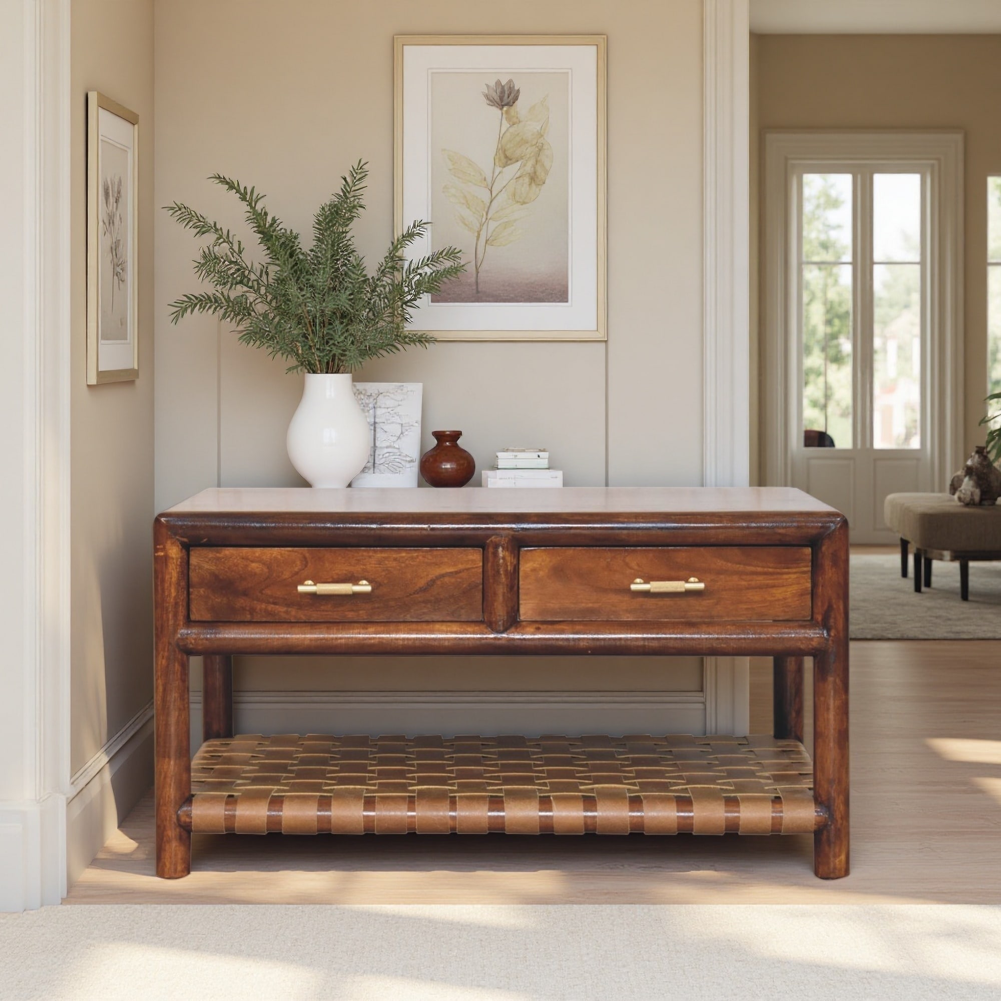 33.5" Solid Mango Wood Console Table with Woven Front, 4 Drawers & Shelf