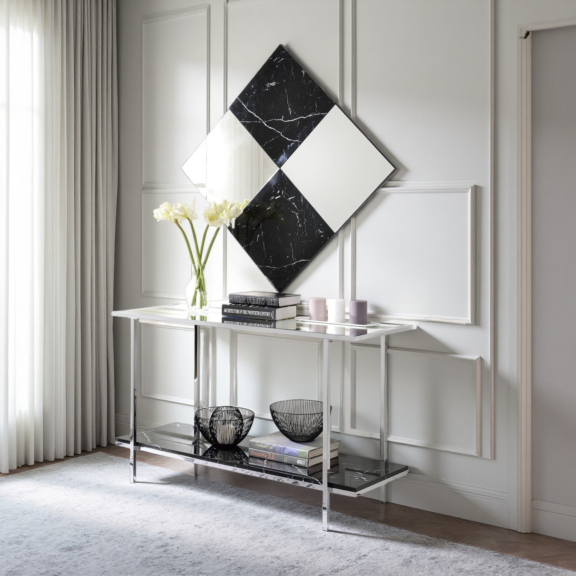 48" Mirrored & Faux Marble Console Table with Metal Frame