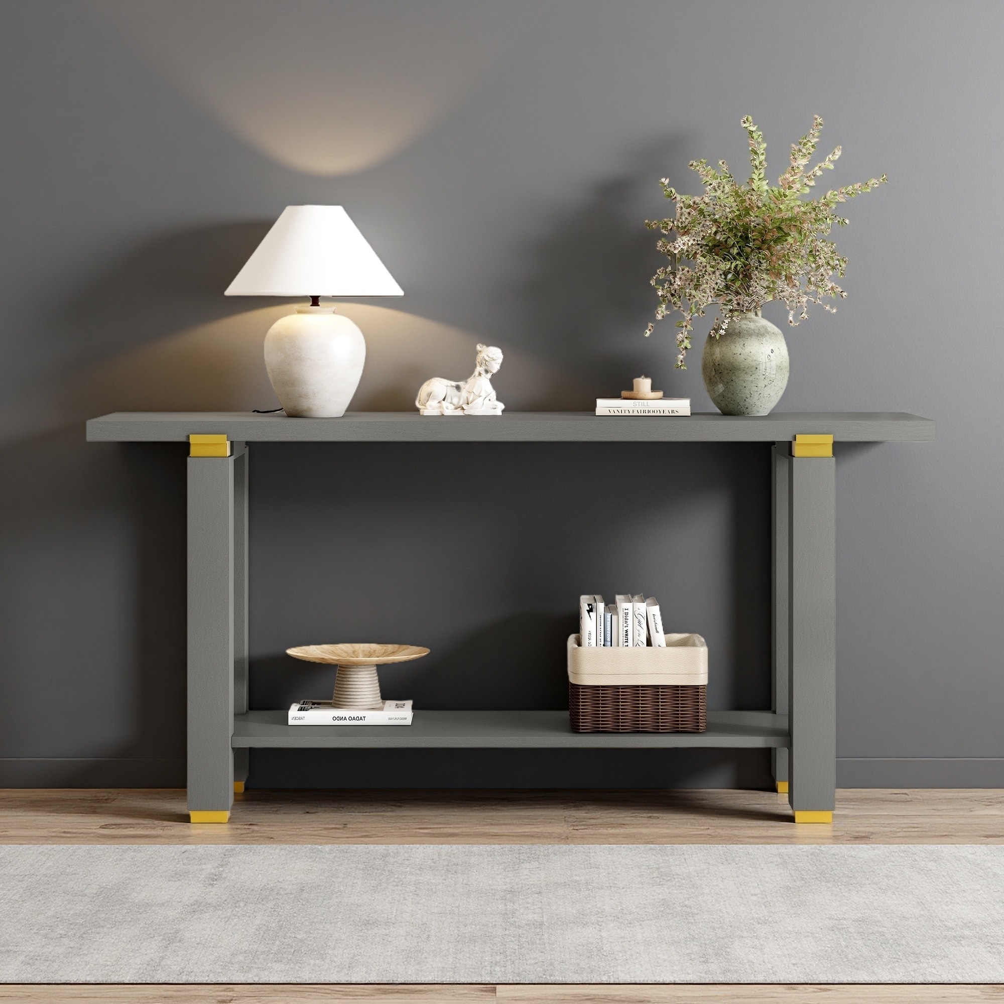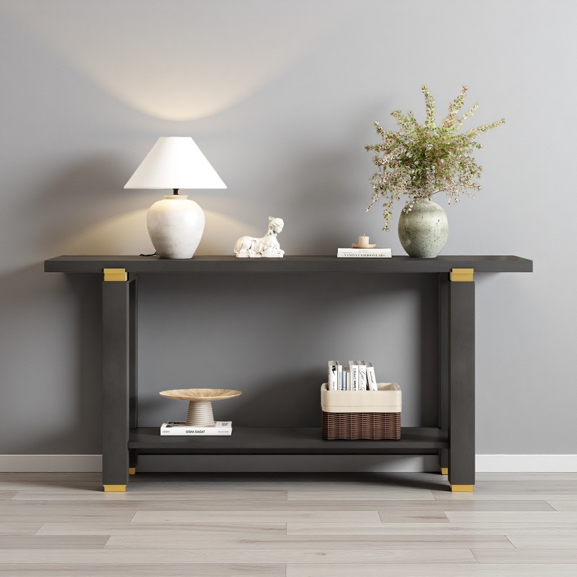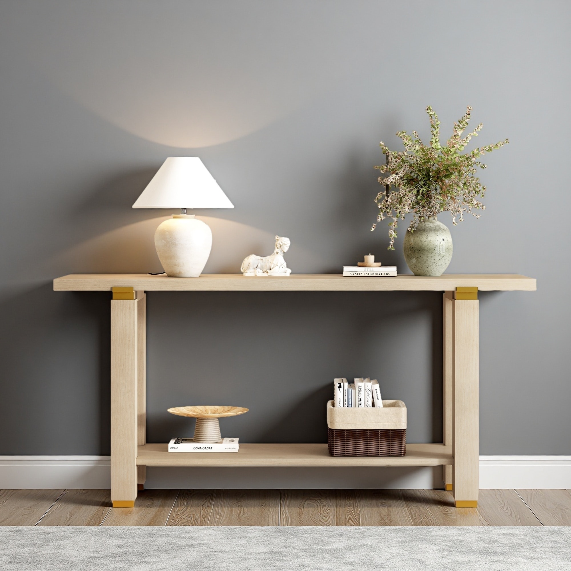 63" Solid Wood Console Table with Metal Accents & Built-In Shelf