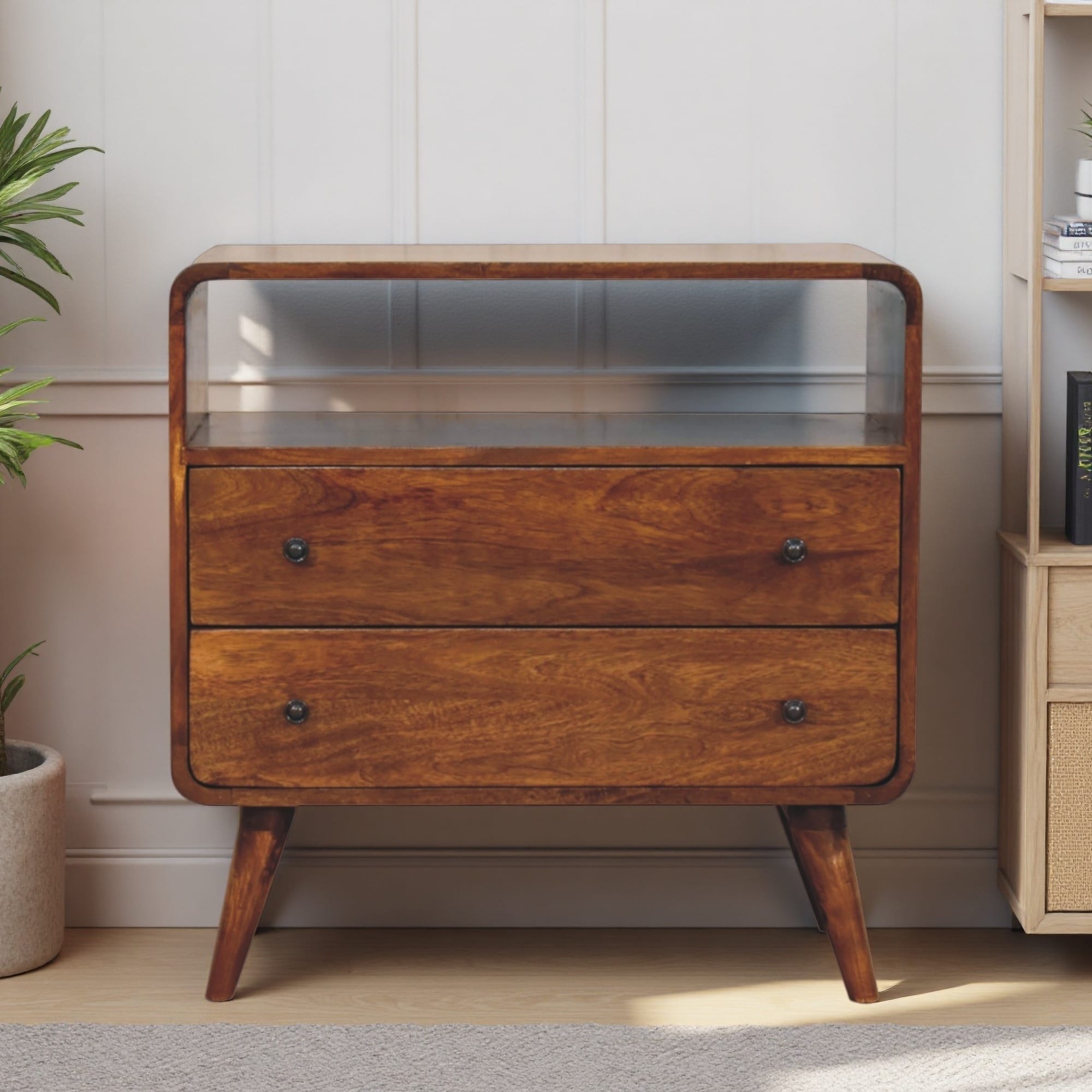 27.6" Solid Mango Wood Console Table with Chestnut Finish, 2 Drawers & Shelf