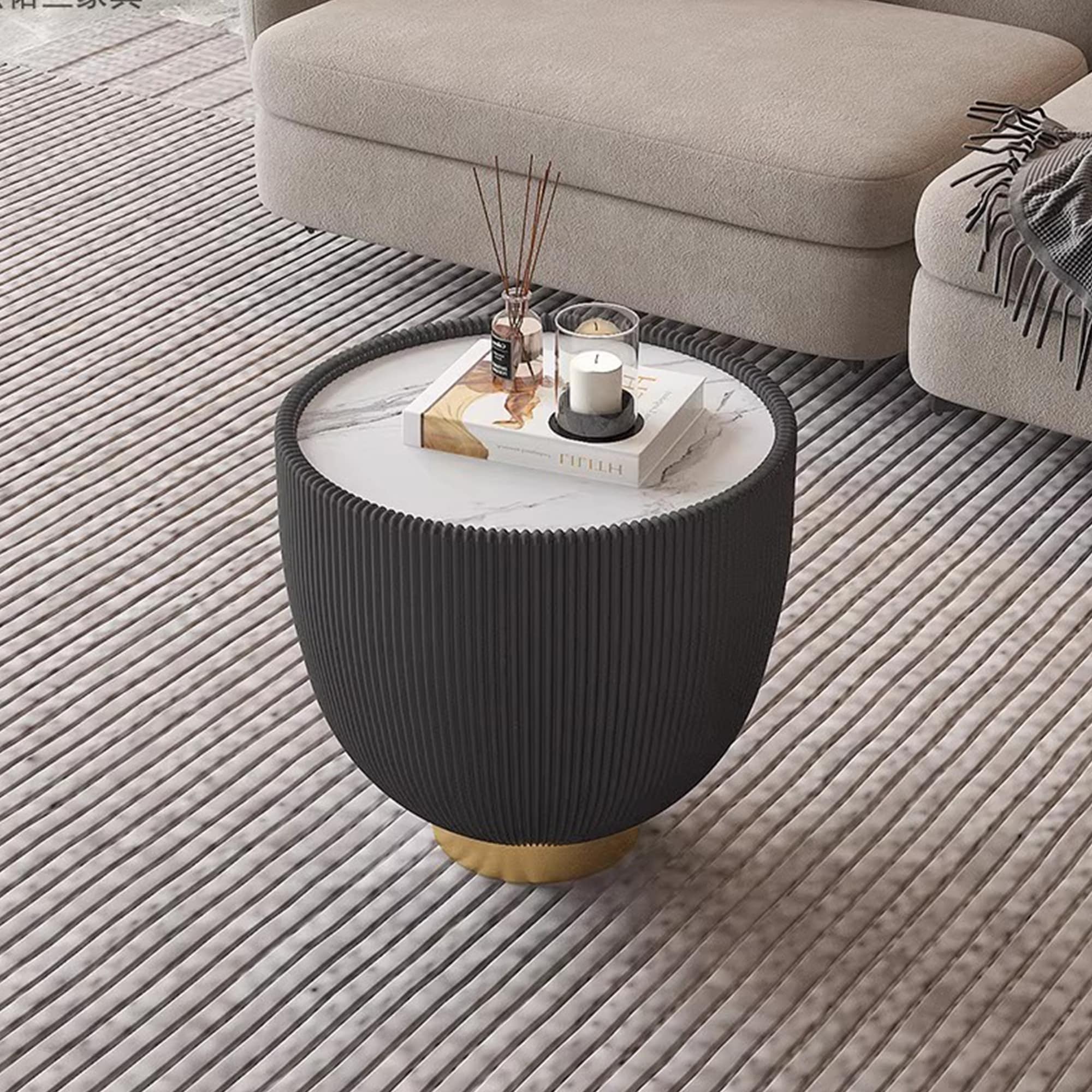 Round Marble Pattern Tabletop Leather Edge Sofa End Table With Metal Base,Luxurious Side Table