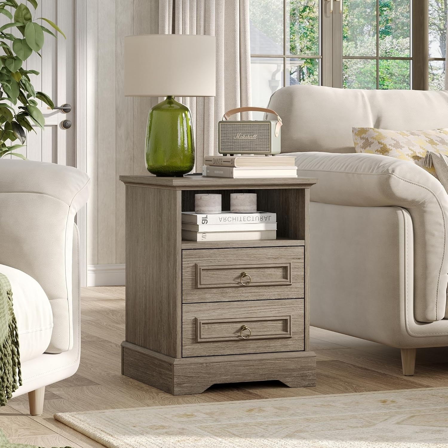Grey Farmhouse Nightstand with Charging Station and 2 Drawers for Bedroom