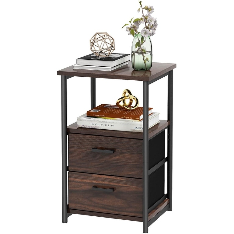 Compact Charging Side Table with 2 Fabric Drawers, Modern Nightstand for Living Room or Bedroom, Brown