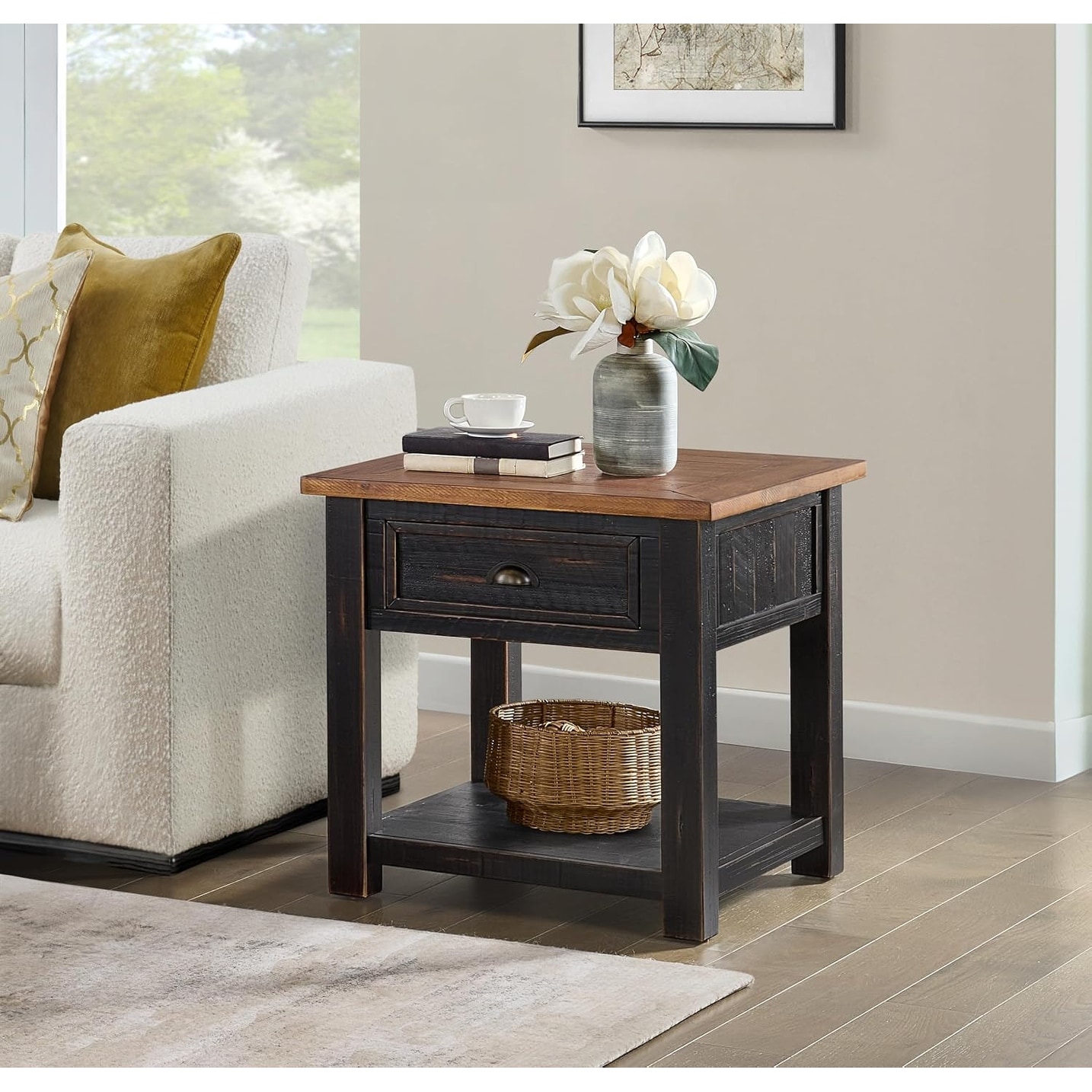 Solid Wood End Table with Drawer and Shelf, Black Base and Honey Brown Top