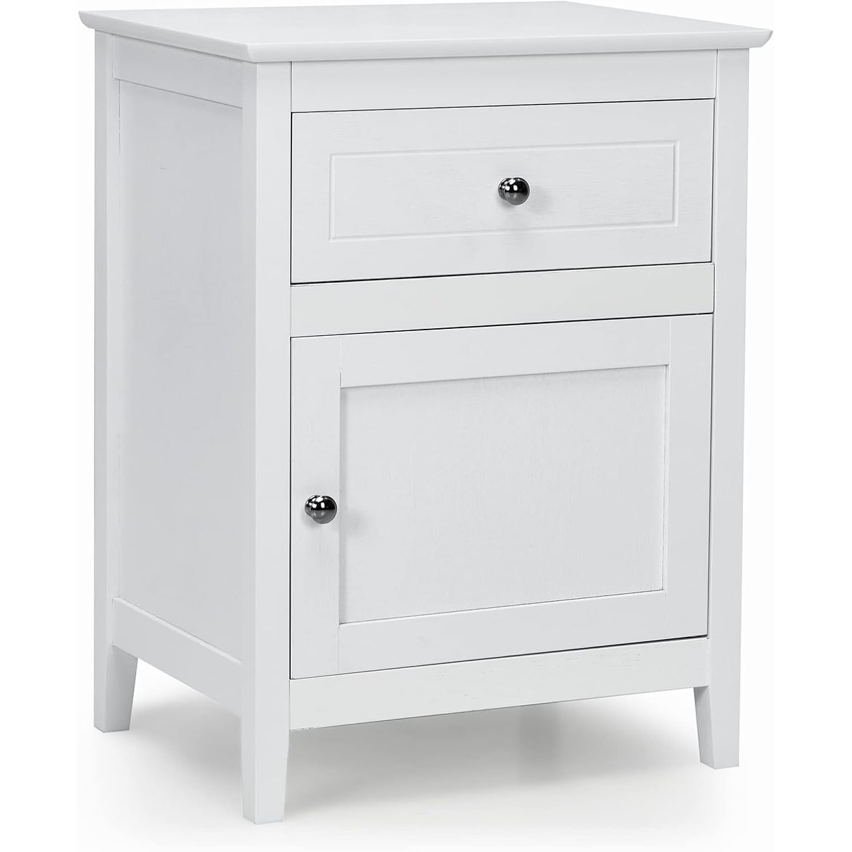 Wooden Nightstand with Drawer and Storage Cabinet, Farmhouse Bedside Table, White, 15x19x25 Inches