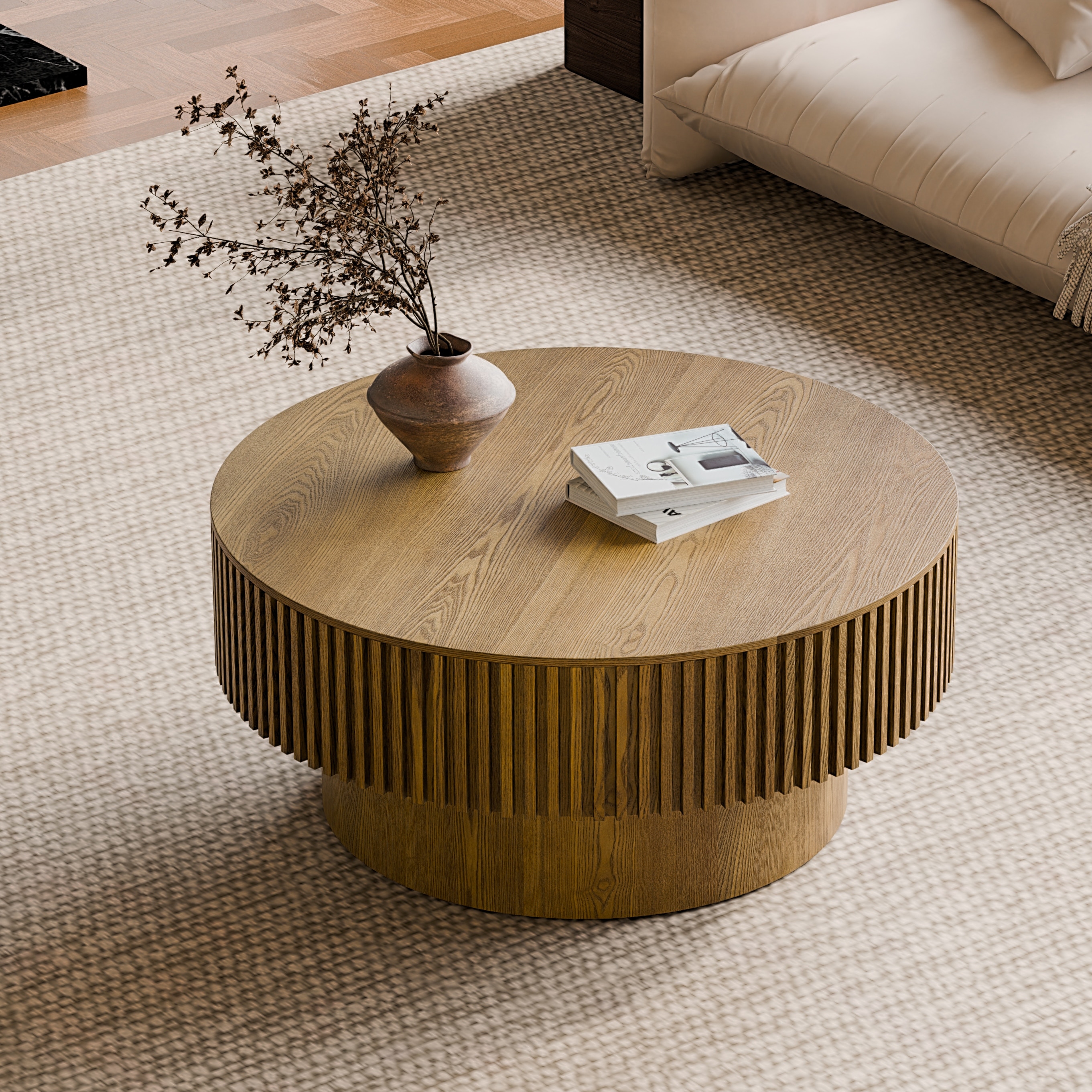 Modern 31.5" Round Coffee Table with Storage Solid Wood Veneer for Living Room and Bedroom Use