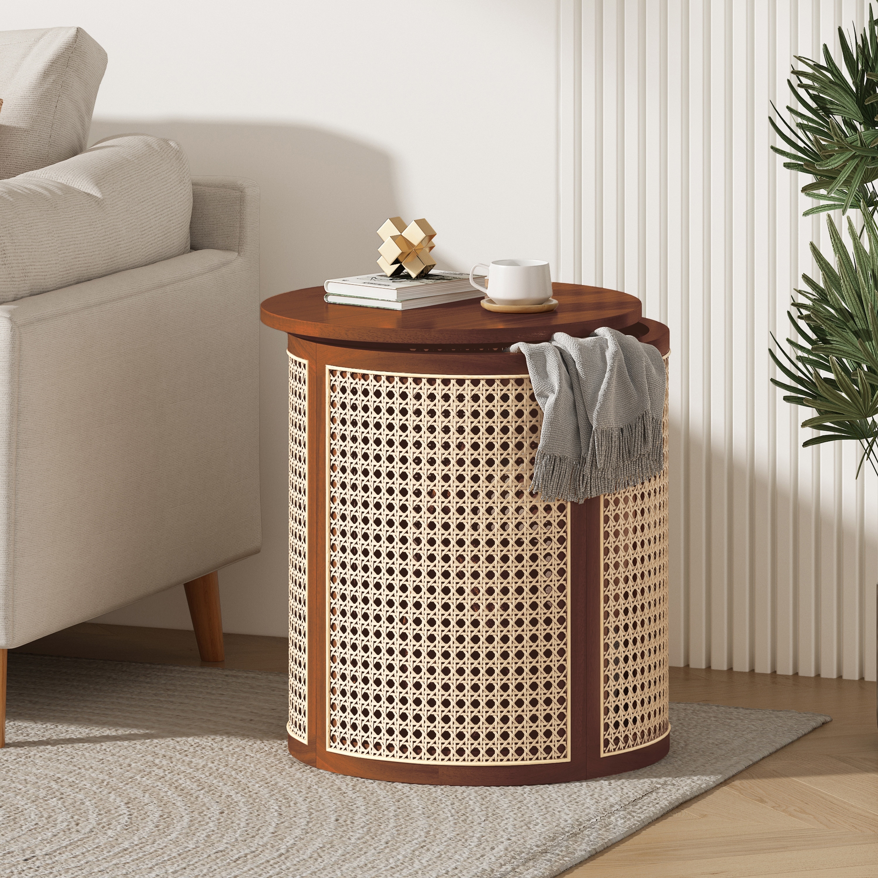 15.70" Round End Table, Hollow Woven Side Table, Small Rubber Wood Nightstand, Rattan Woven Tea Desk