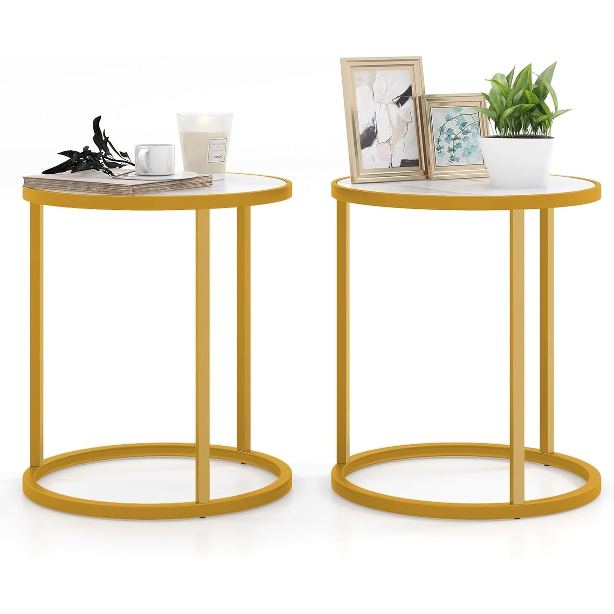 Modern Round Gold Side Table Set with Sintered Stone Top, Metal Frame for Living Room Bedroom, Easy Assembly