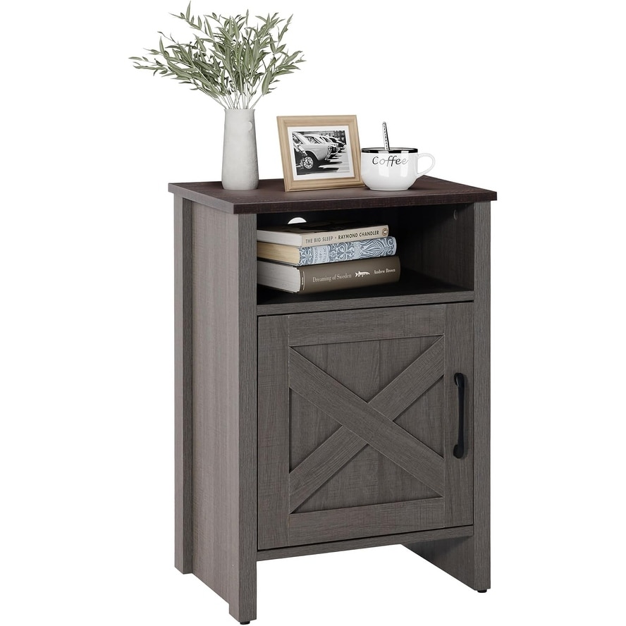 Rustic Wood Nightstand with Storage Shelf, Barn Door Design, Grey Finish
