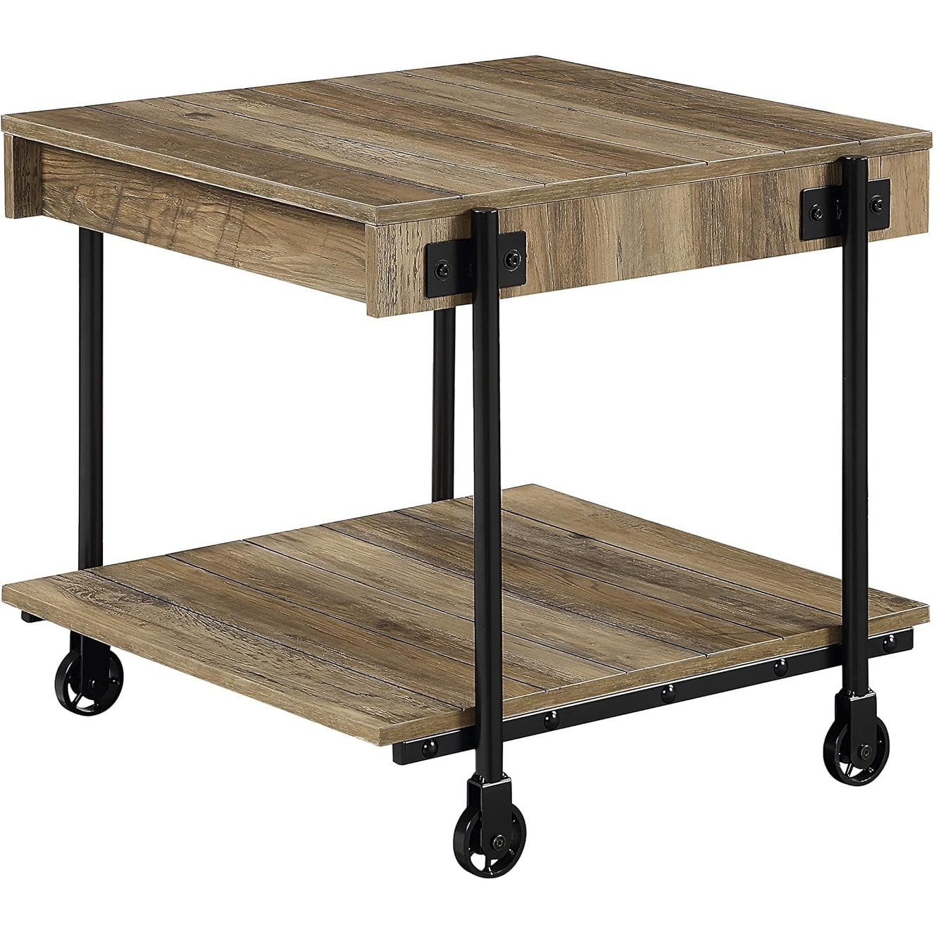 Industrial 24-inch Square End Table with Wheels for Living Room, Bedroom, Black and Rustic Oak Brown