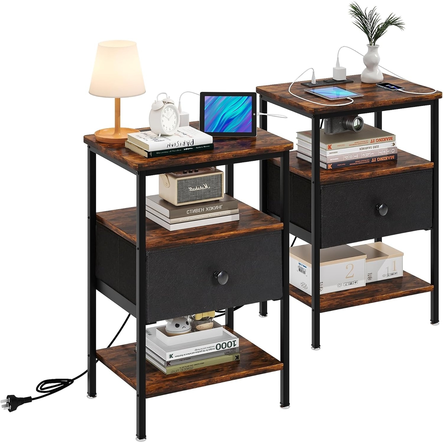 2-Piece Nightstand Set with Charging Station, Fabric Drawer, USB Ports, AC Outlets, Open Shelf for Bedroom or Living Room
