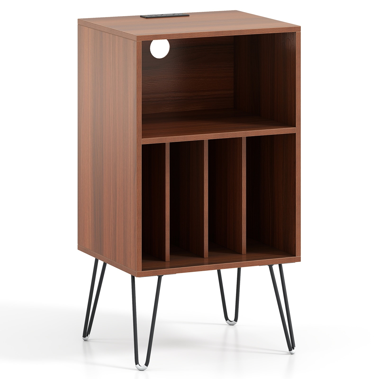 Rustic Walnut Record Player Stand with Vinyl Storage Cabinet and Charging Station Turntable Table Holds Up to 150 Albums