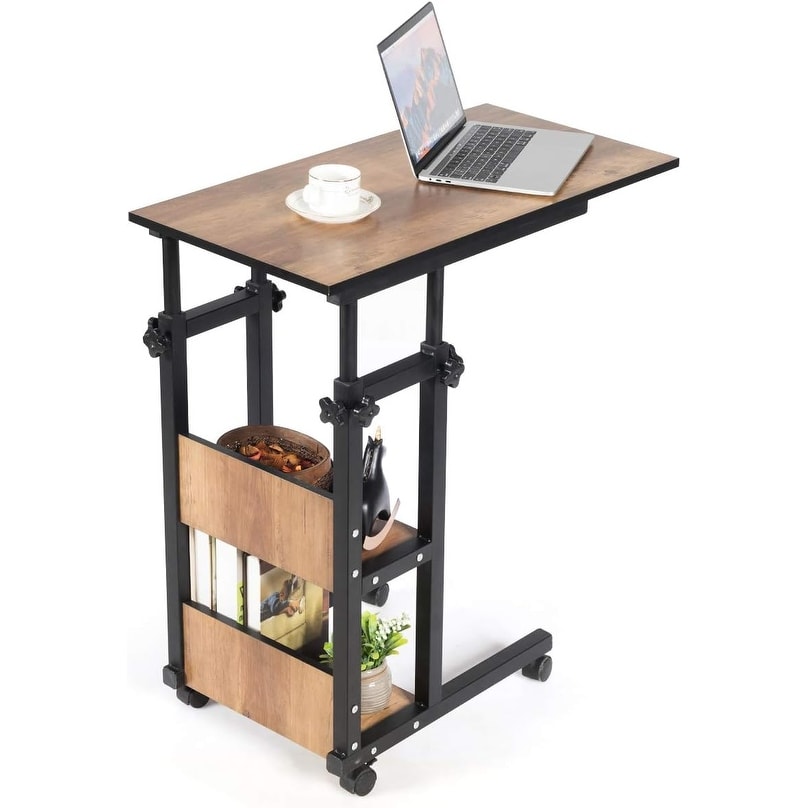 Adjustable Height C-Shape Mobile Sofa Side Table with Storage Shelves, Rolling Bedside Coffee Table, Wood Look Accent Furniture