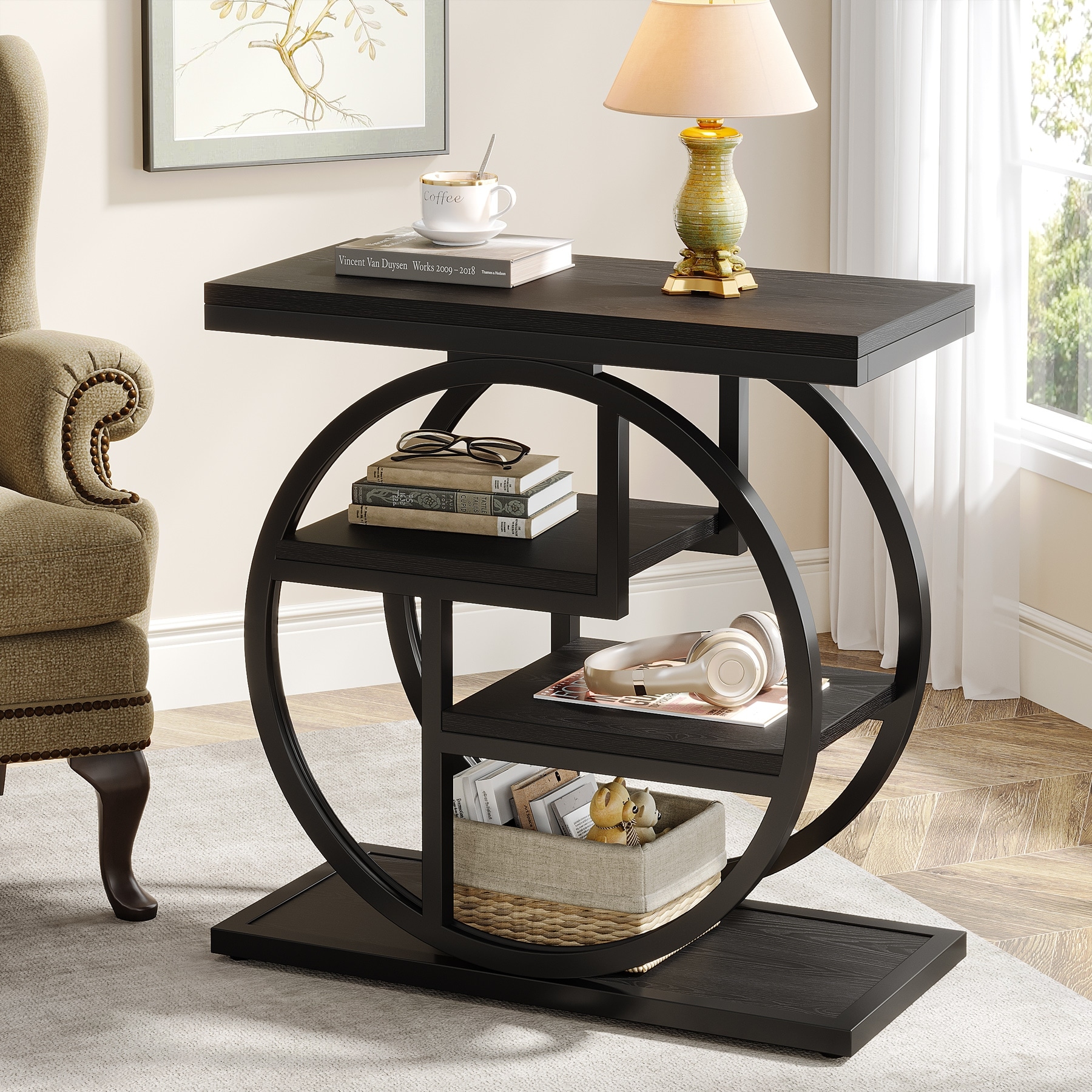 Industrial 4-tier Wood Narrow Side End Table with Storage Shelves