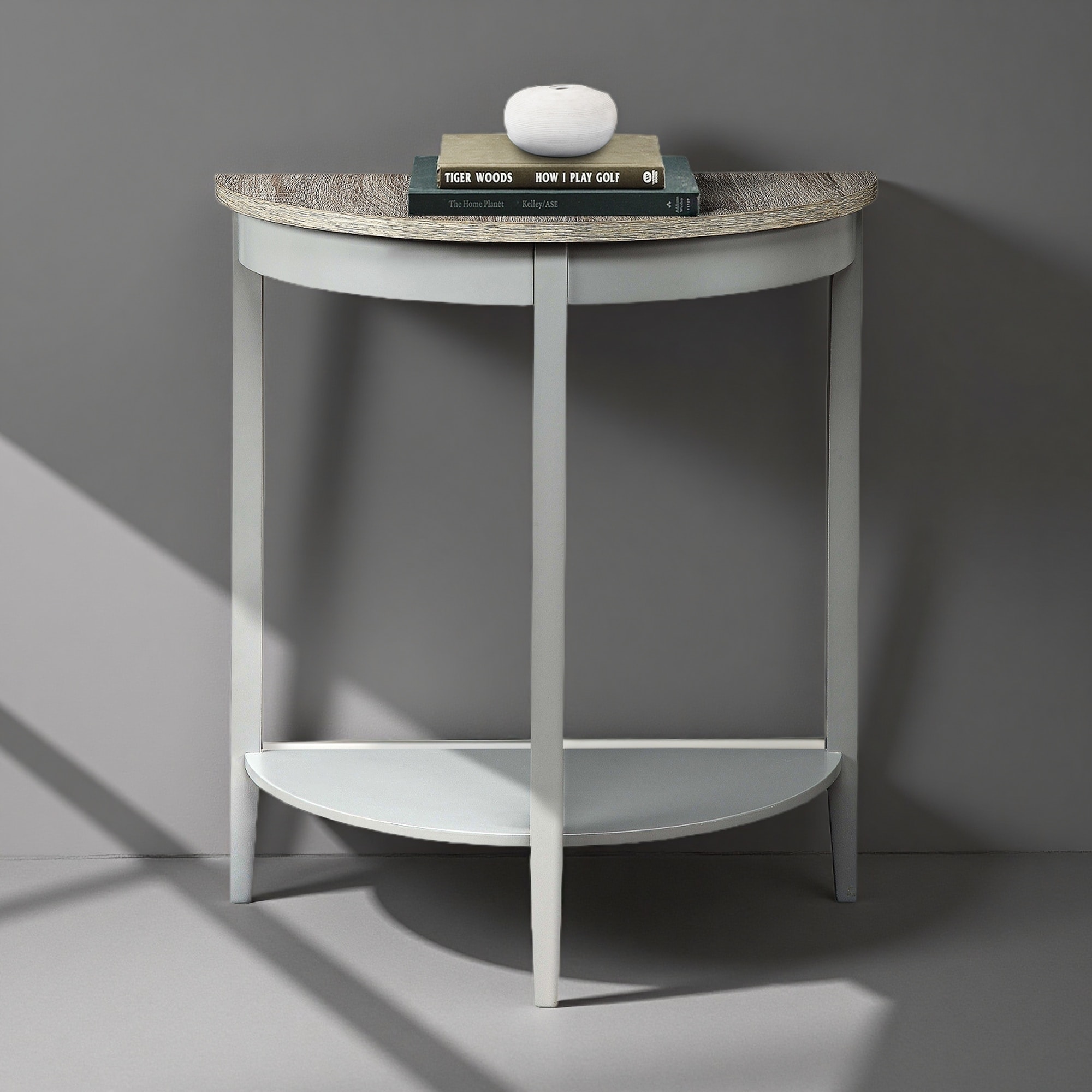 26" Solid Pine Wood Half-Moon Console Table with Open Shelf, 3D Wood Grain Finish & Minimalist Design for Entryway