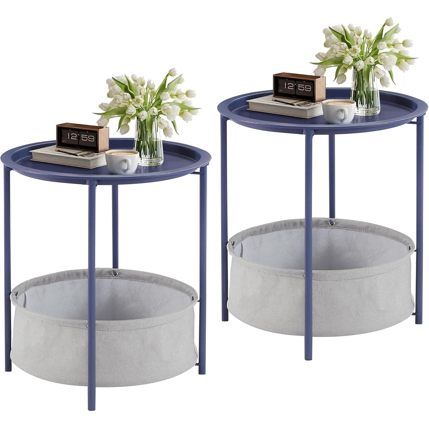Round Side Table with Removable Fabric Storage Basket, Anti-Rust Metal Nightstand for Living Room, Balcony & Laundry