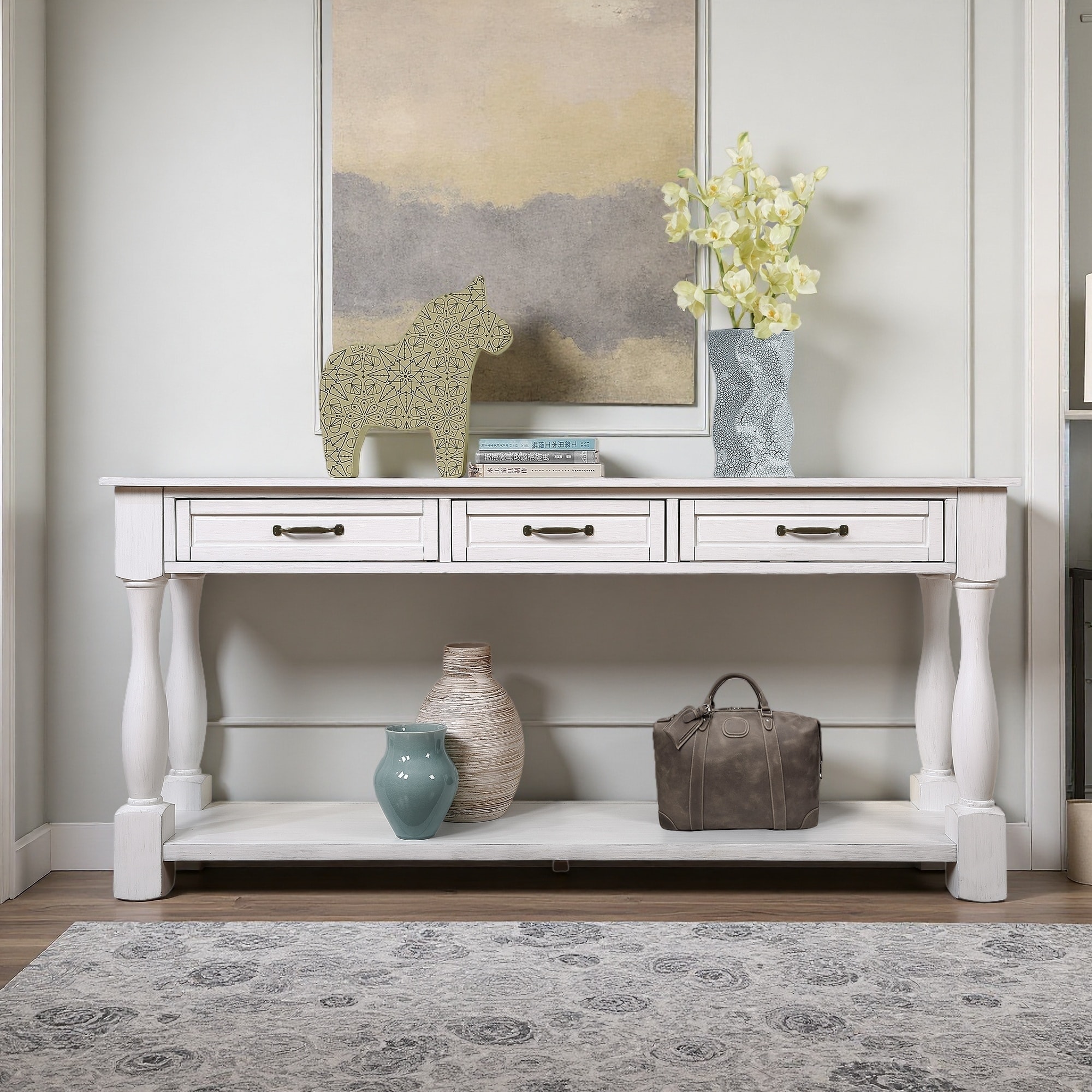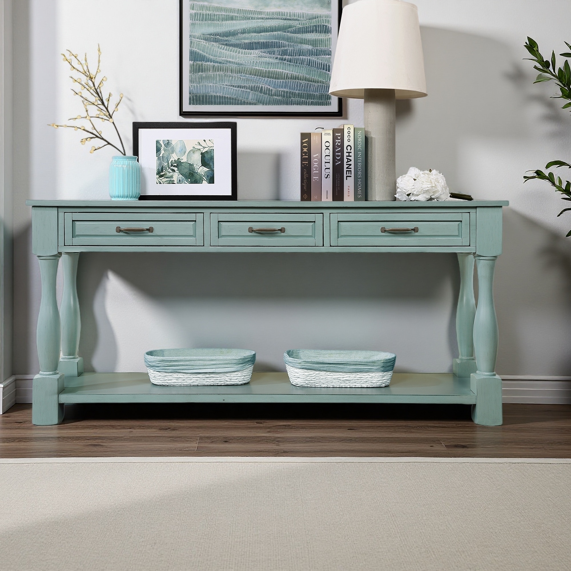 Solid Wood Living Room Console Table, Classic Retro Storage Entryway Sofa Table with 3 Top Drawers and Open Bottom Shelf