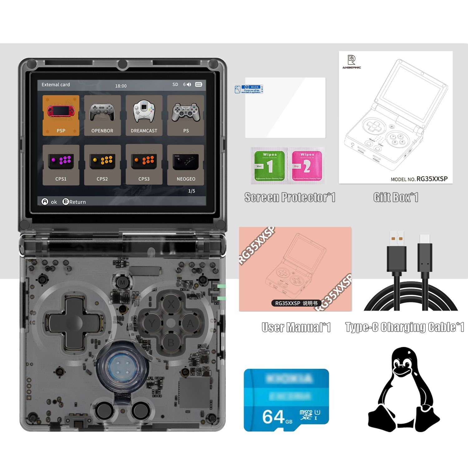 ANBERNIC RG35XXSP Retro Handheld Game Console With 3.5 Inch IPS Screen And 3300mAh Battery silver 64g
