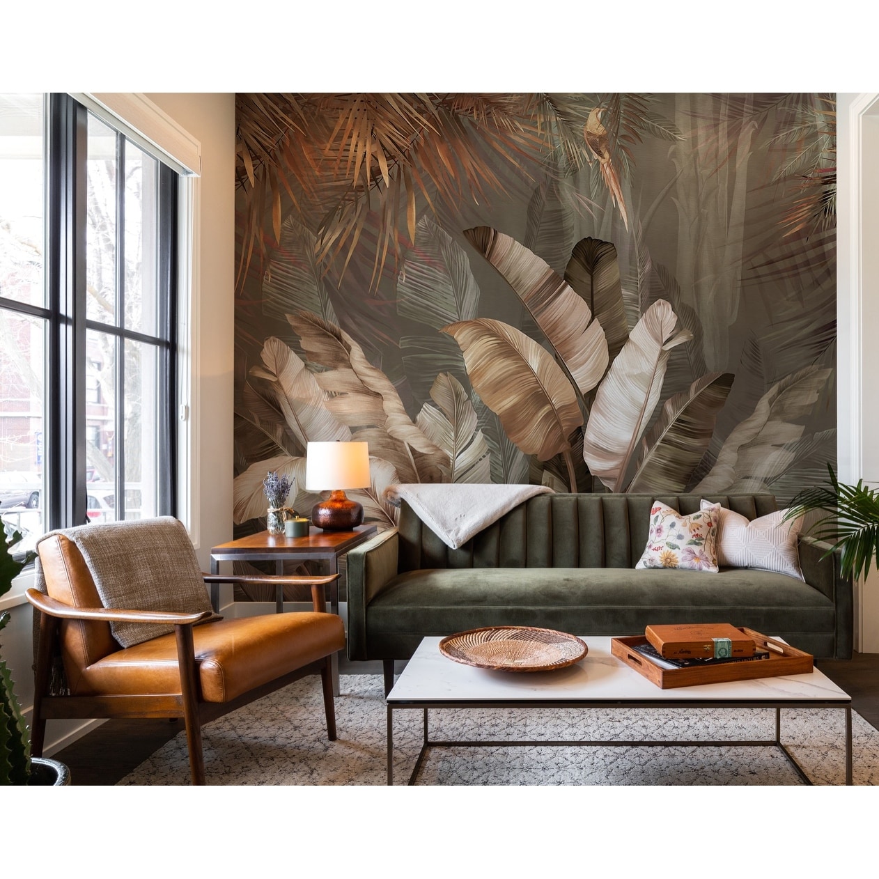 Lush Tropical Forest Mural with Vibrant Palms and Parrot