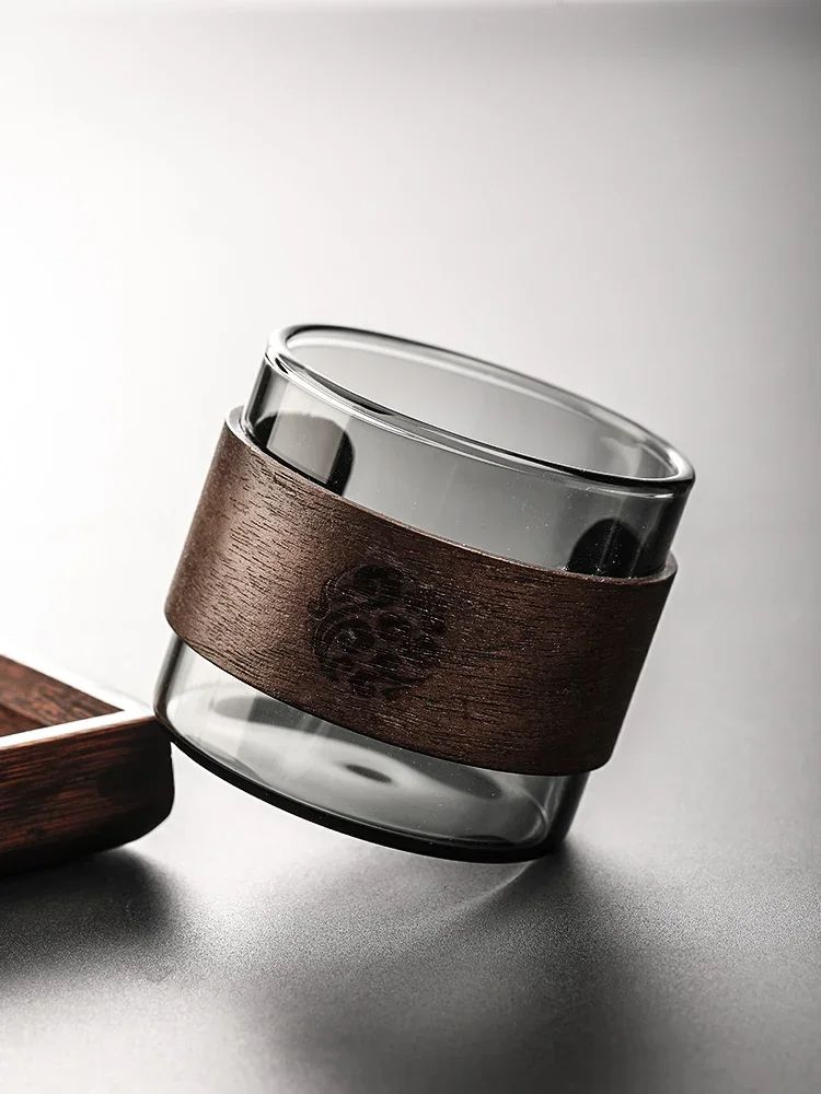 Walnut Handle Borosilicate Glass Water Cup, Vertical Ash Colored Household Tea Cup For Living Room & Kitchen Use 1pc 150ml