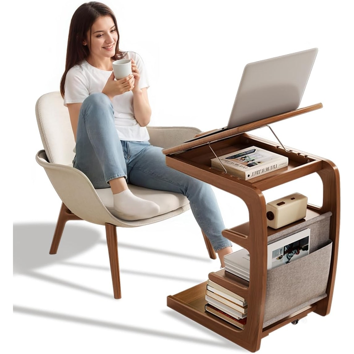 Compact Rolling C-Shaped End Table with Adjustable Desktop and 4 Wheels for Home Office or Couch Use