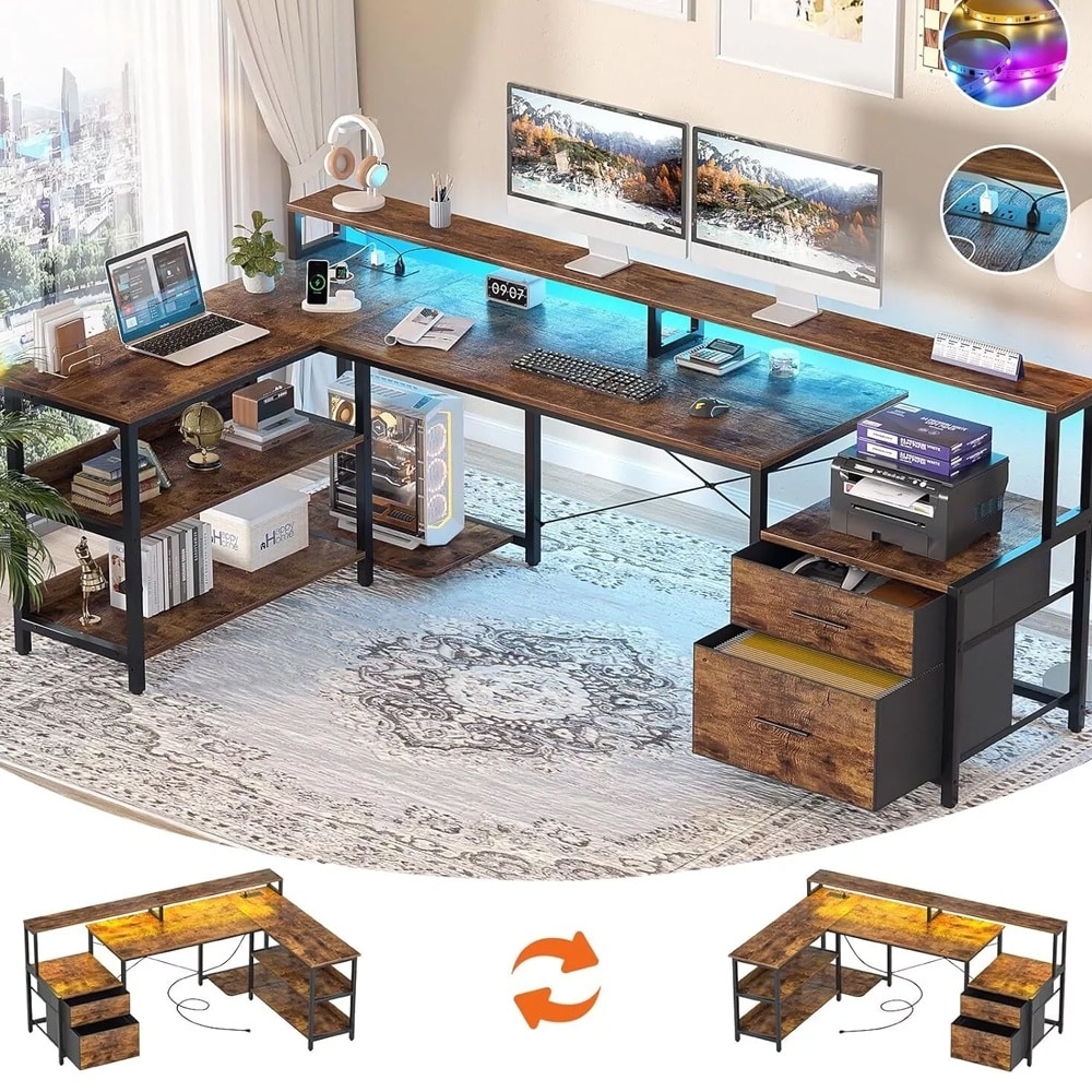 67" L Shaped Desk Computer Power Outlets LED Lights Drawers Brown