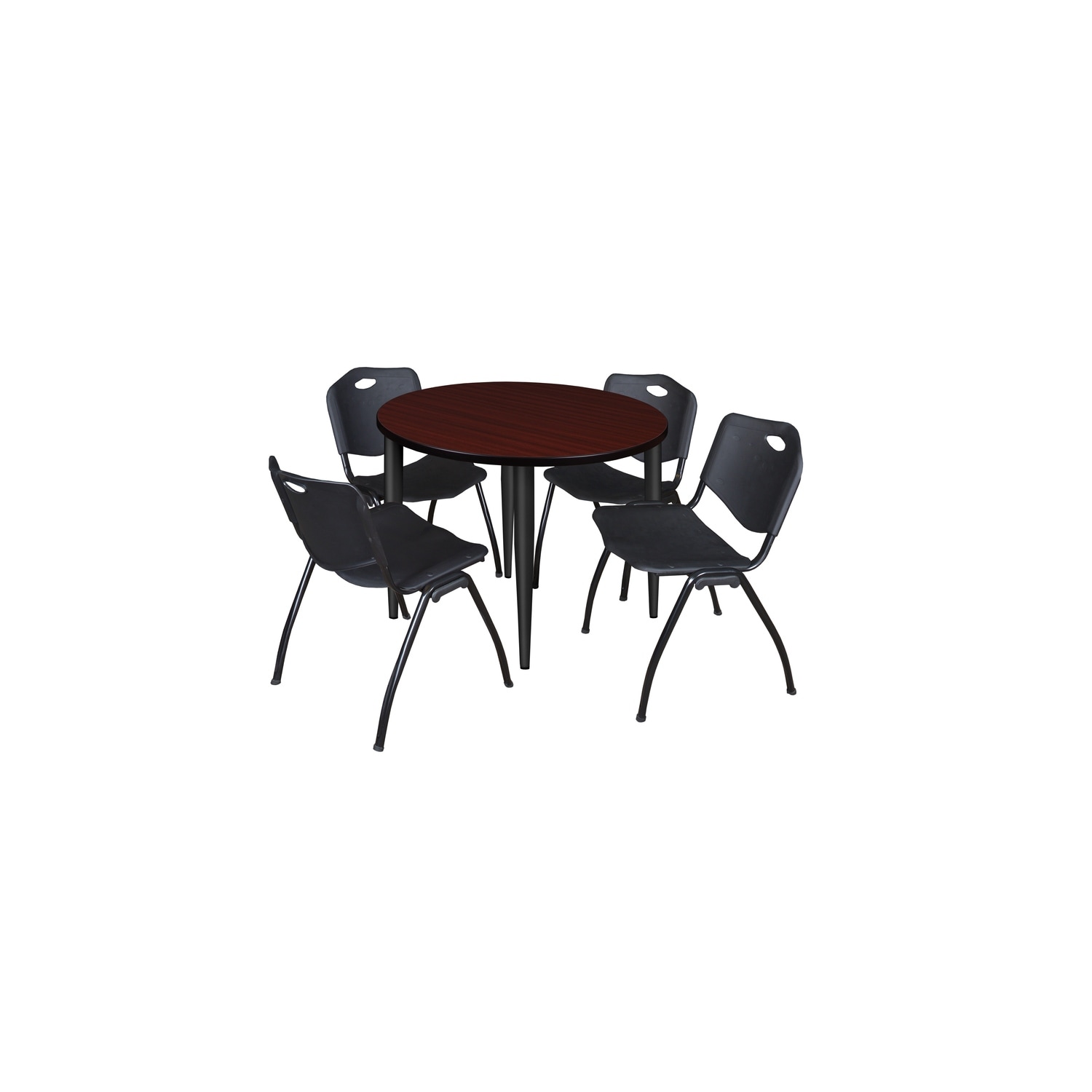 42 in. Round Breakroom Table- Mahogany Top, Black Base & 4 M Stack Chairs- Black