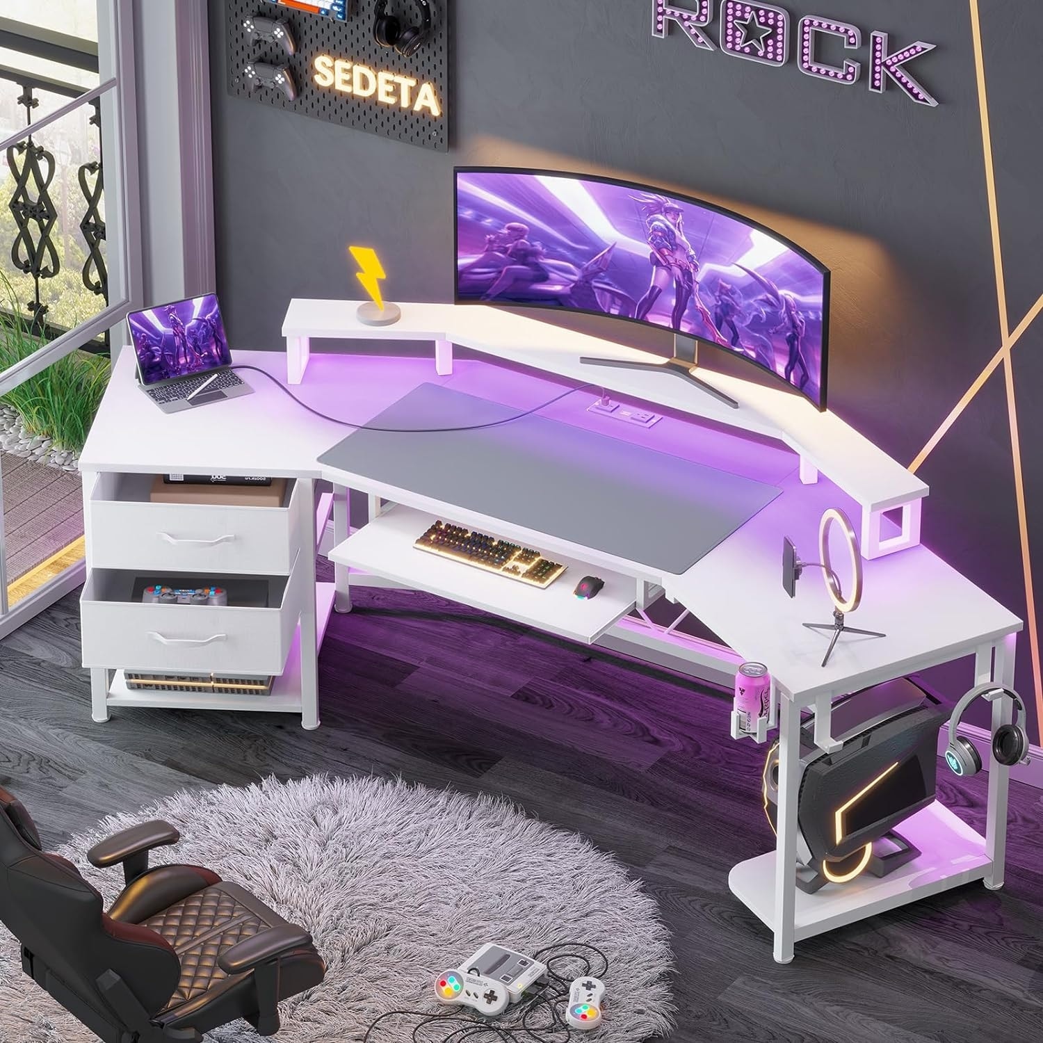79" L Shape Gaming Desk Computer Desk 2 Fabric Drawers & LED Light