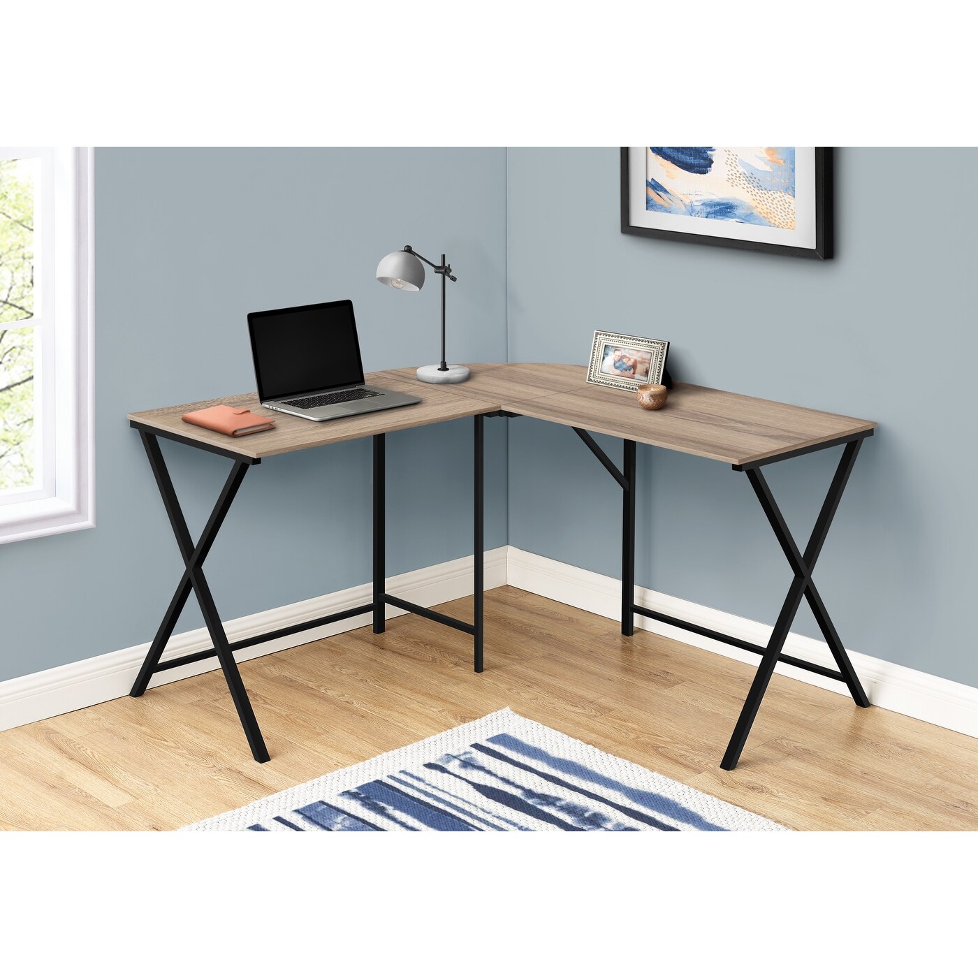 L-Shaped Computer Desk, Brown Laminate, Grey Metal, Modern, Corner Design, Storage Shelf