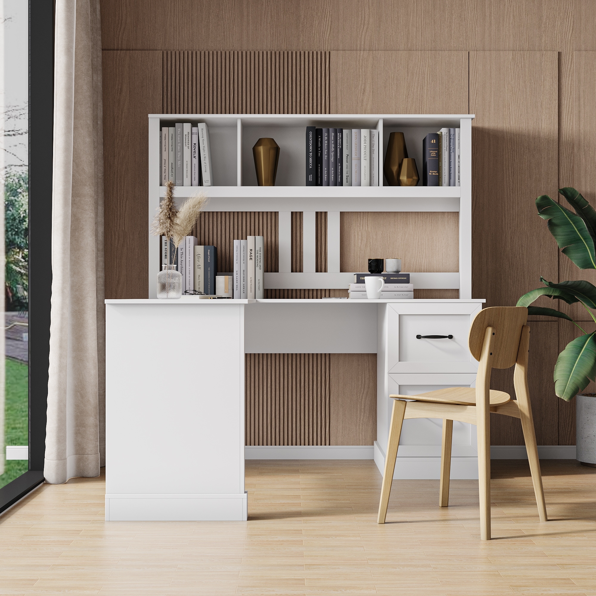 Roomfitters L-Shaped Home Office Computer Desk with Hutch, Corner Workstation with Drawers and Shelves