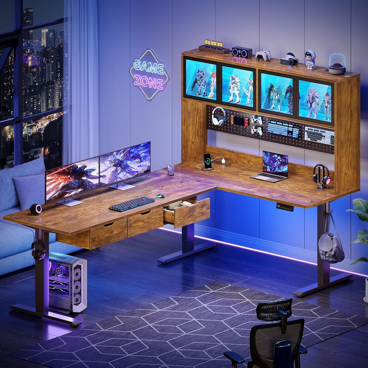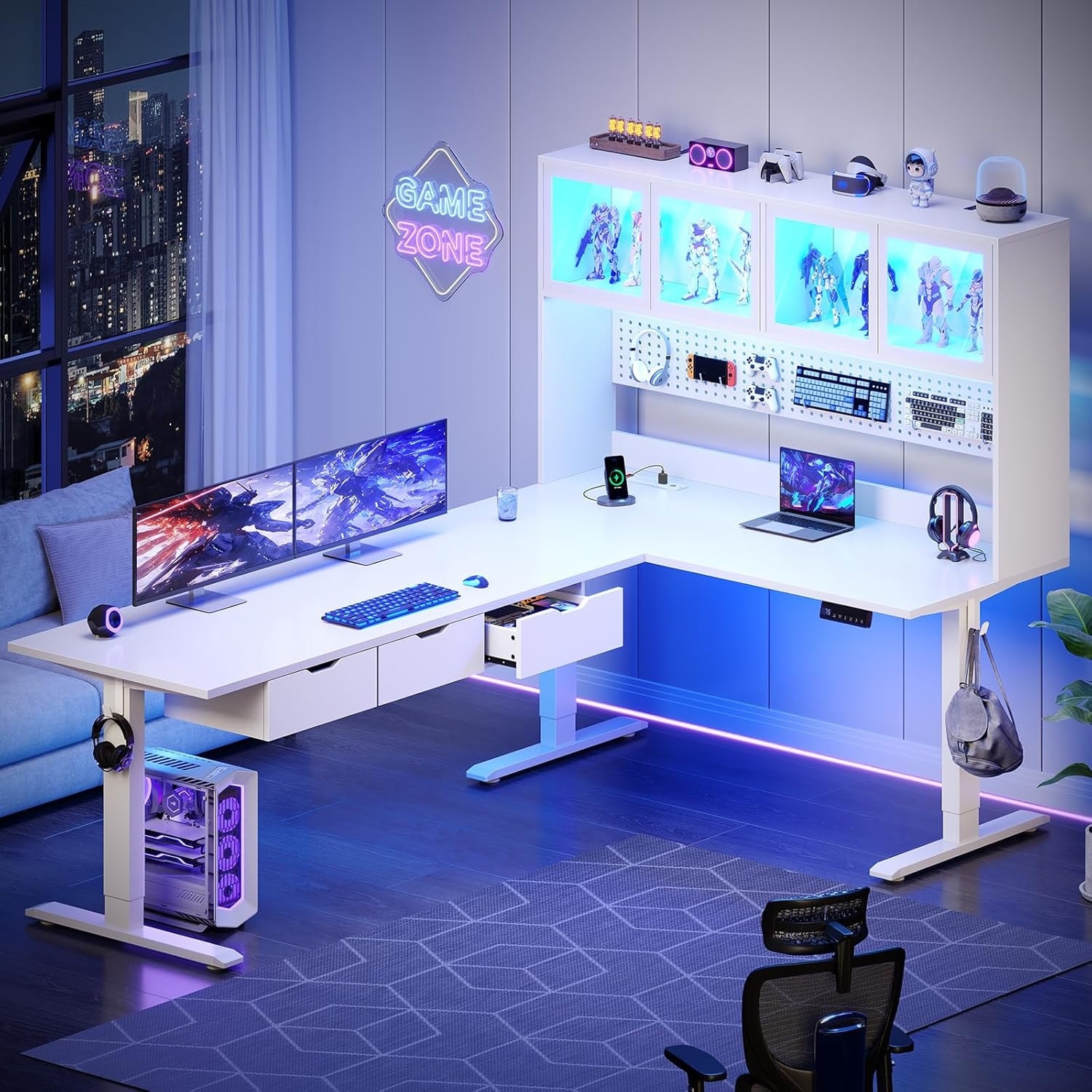 LED Computer Desk with Lock Drawers Keyboard Tray Power Outlet Gaming Desk