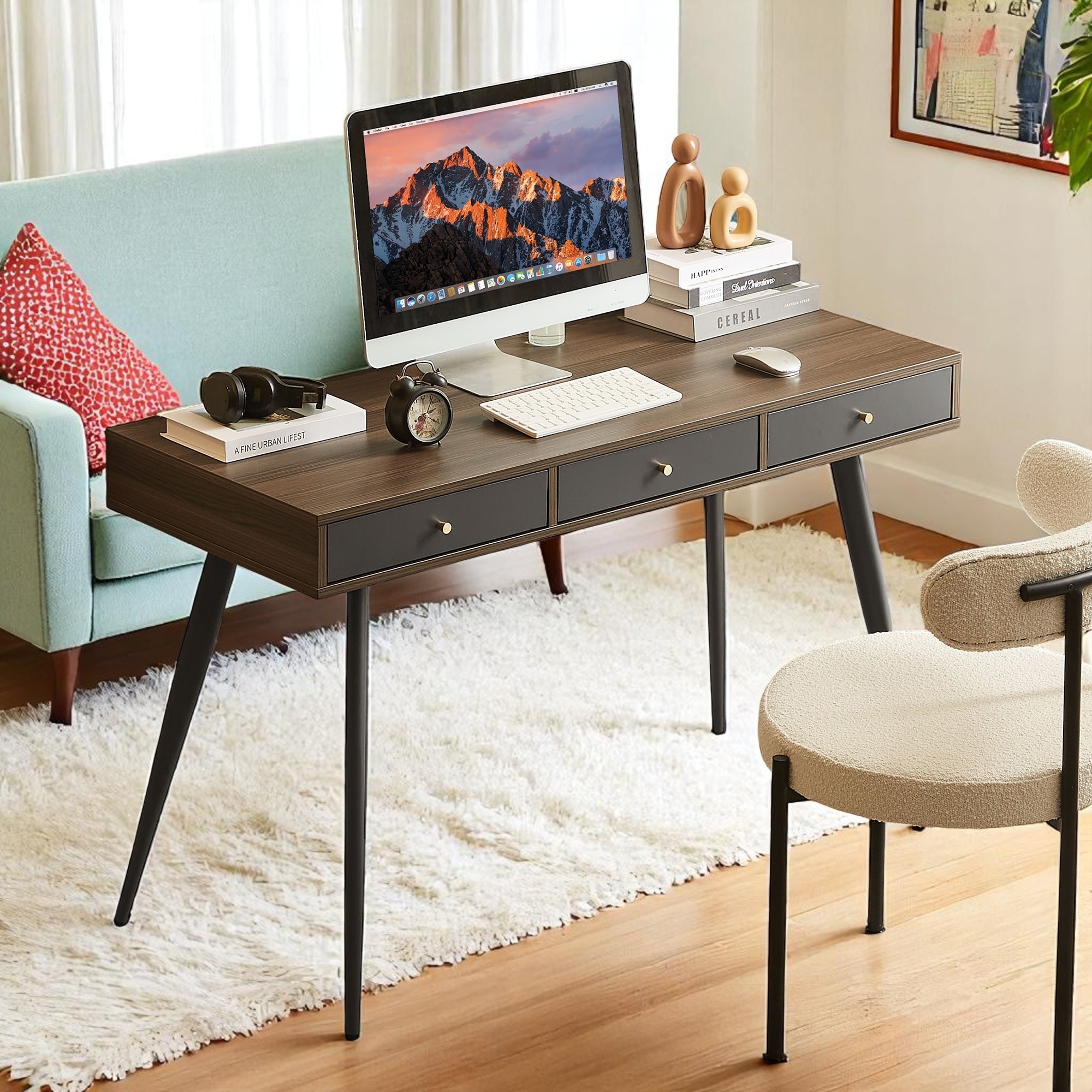 Mid Century Modern Writing Desk with Drawers, 47" MDF Computer Desk, Walnut and Dark Grey Office Table for Home, Study