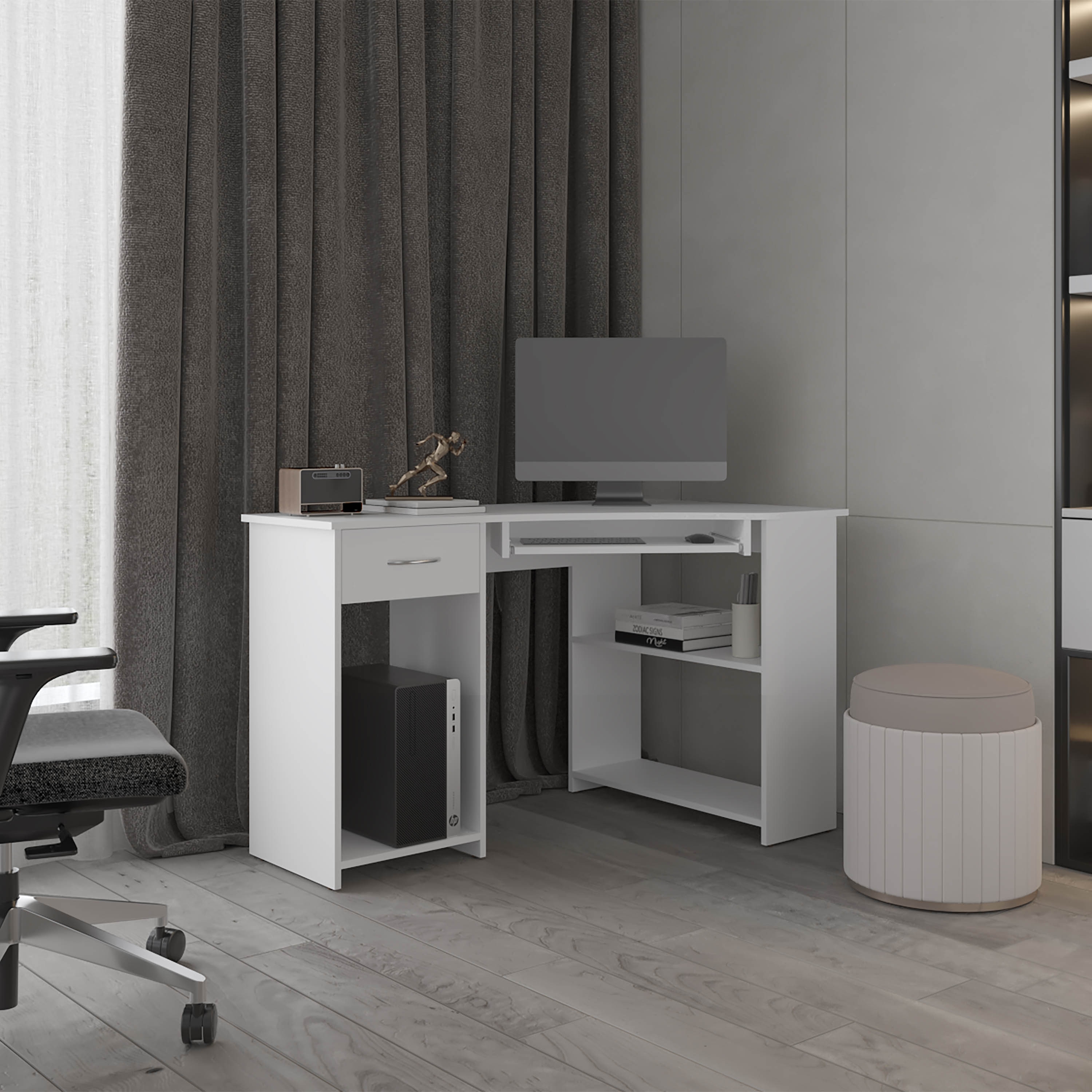 Corner Desk 29.5" H, 2 Drawers, 3 Shelves, White - Office