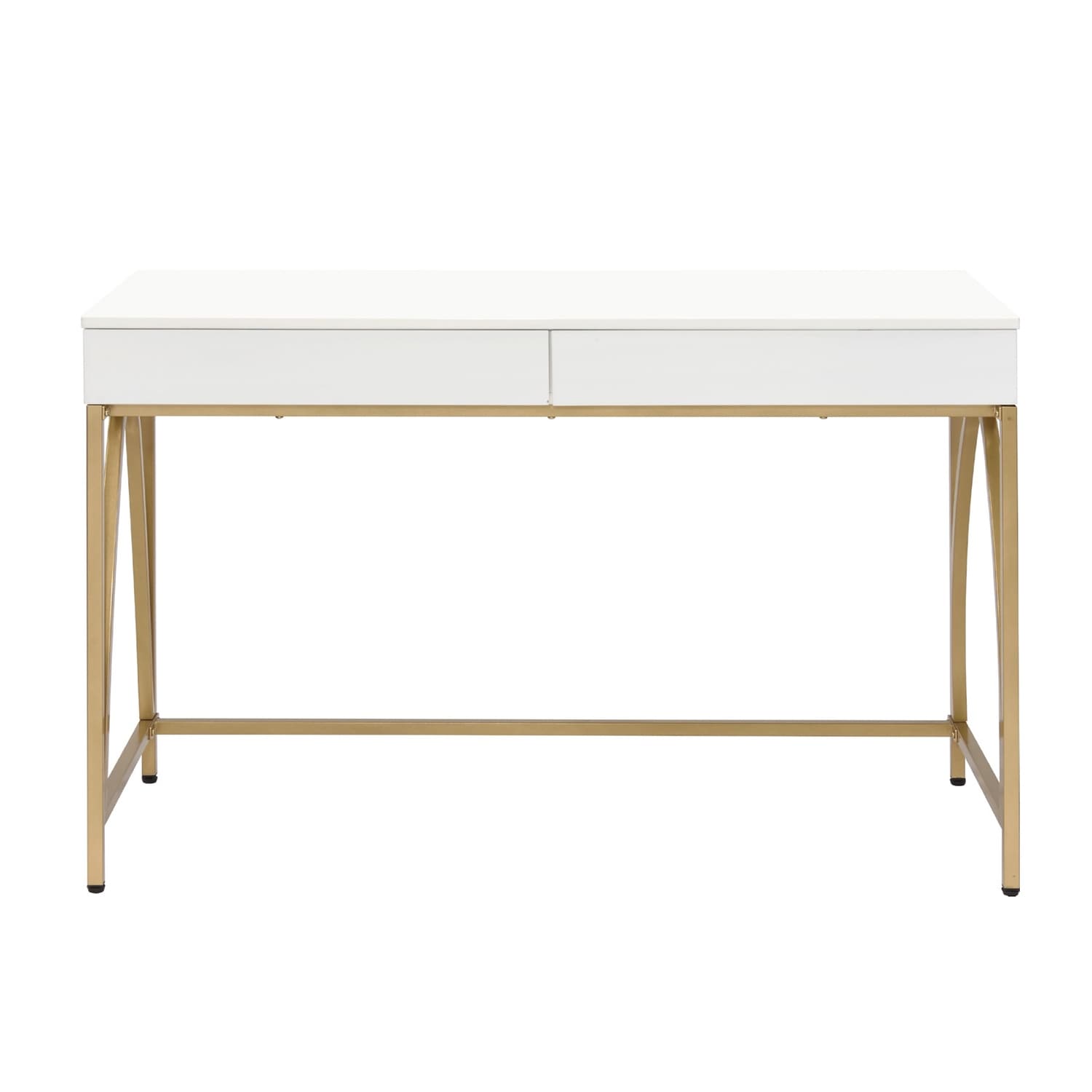 2 Drawers Writing Desk with Metal Trestle Base, White High Gloss and Gold