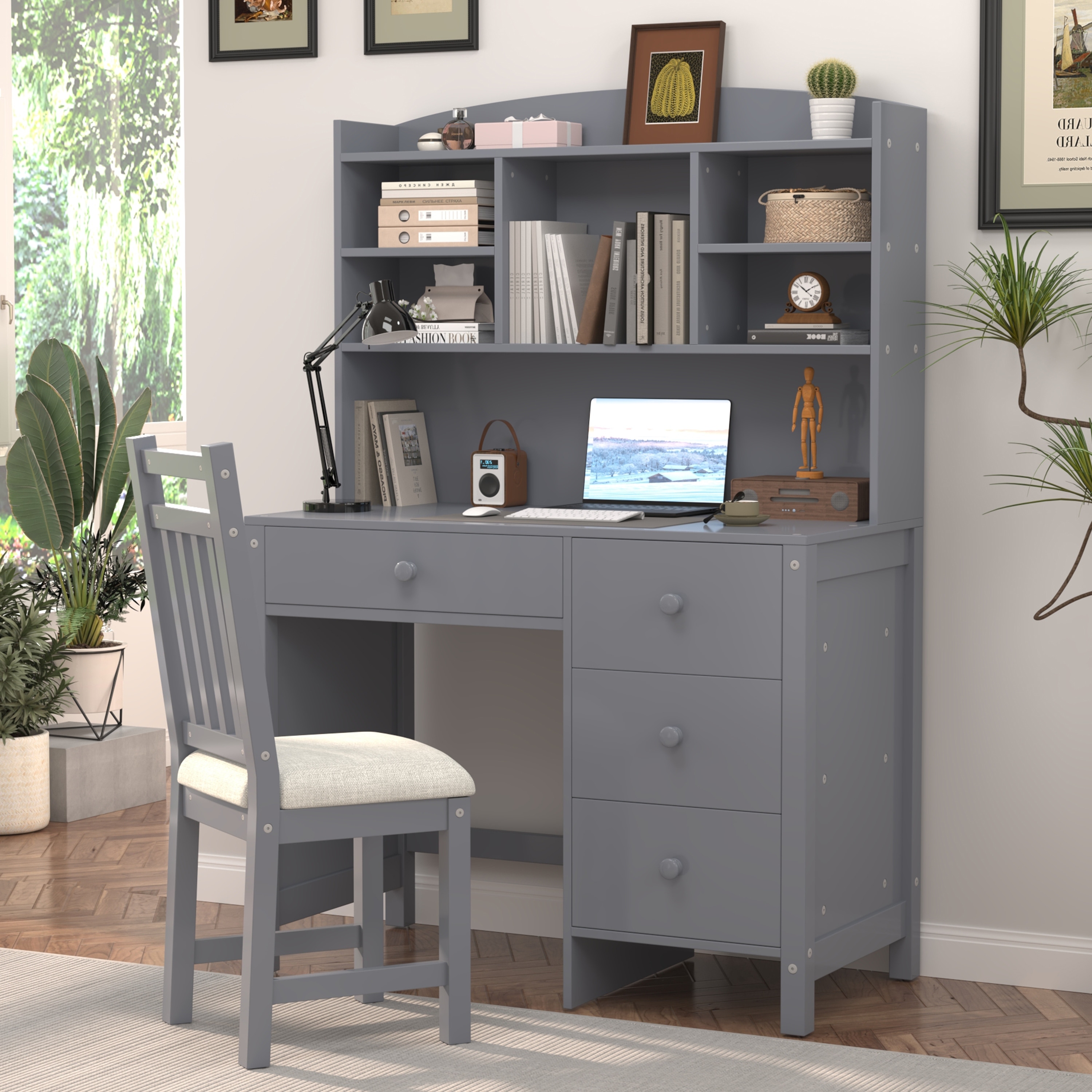 40" Home Executive Desk and Upholstered Chair Set, Wooden Office Desk Gray Computer Desk with Bookshelf & Drawers