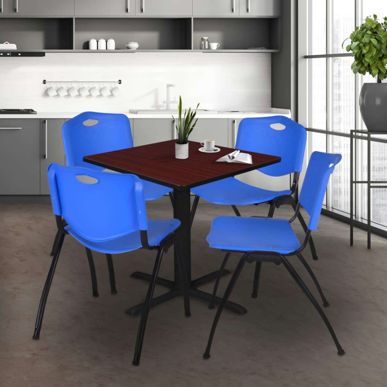 42" Square Breakroom Table- Mahogany & 4 'M' Stack Chairs- Black - Blue, Black, Mahogany - 42