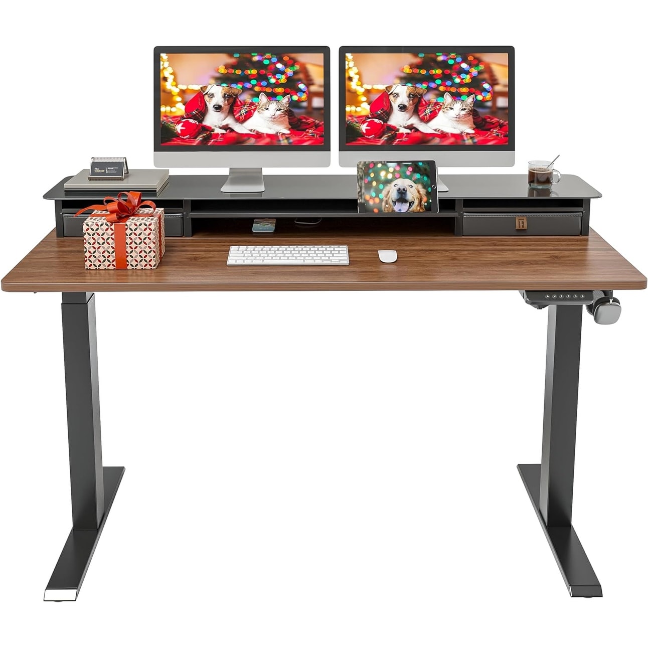 FEZIBO Height Adjustable Glass Electric Standing Desk with Double Drawer, Stand Up Desk with Storage Shelf