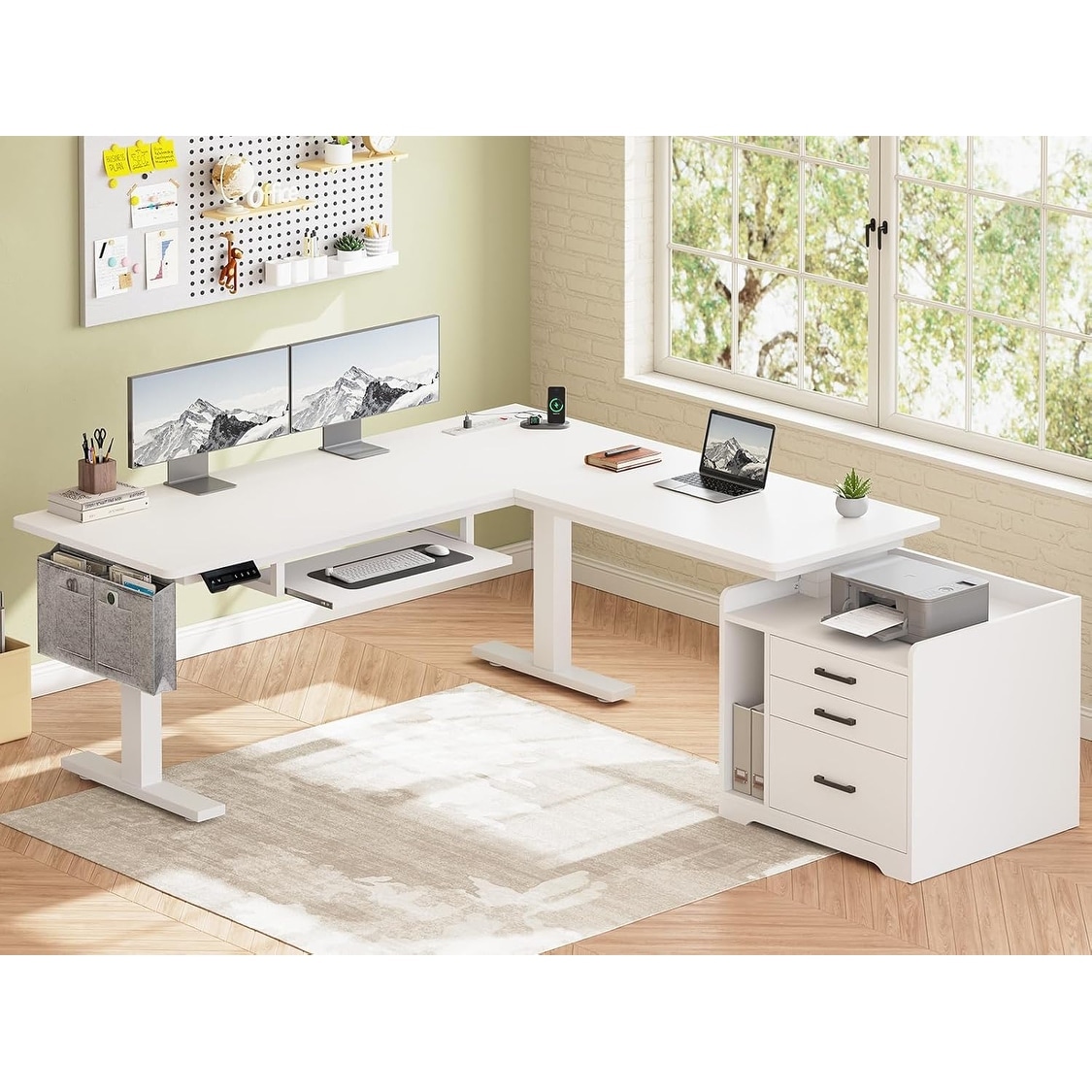 L Shaped Electric Standing Desk with File Cabinet Height Adjustable 63 x 53''