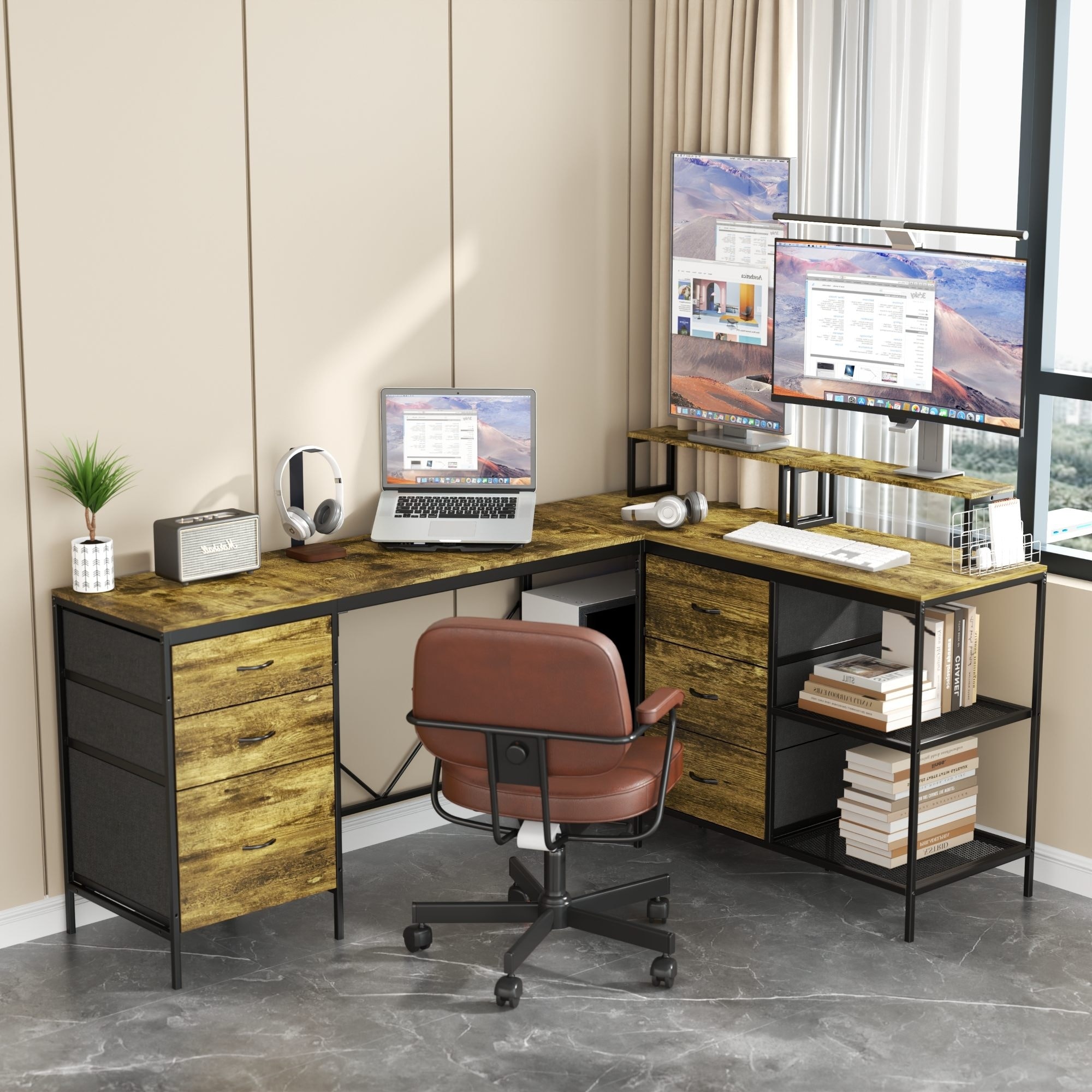 Techni Mobili Modern L-Shaped Desk with Storage. Corner Computer Desk with Shelves, Drawers & Fabric Organizer, Black