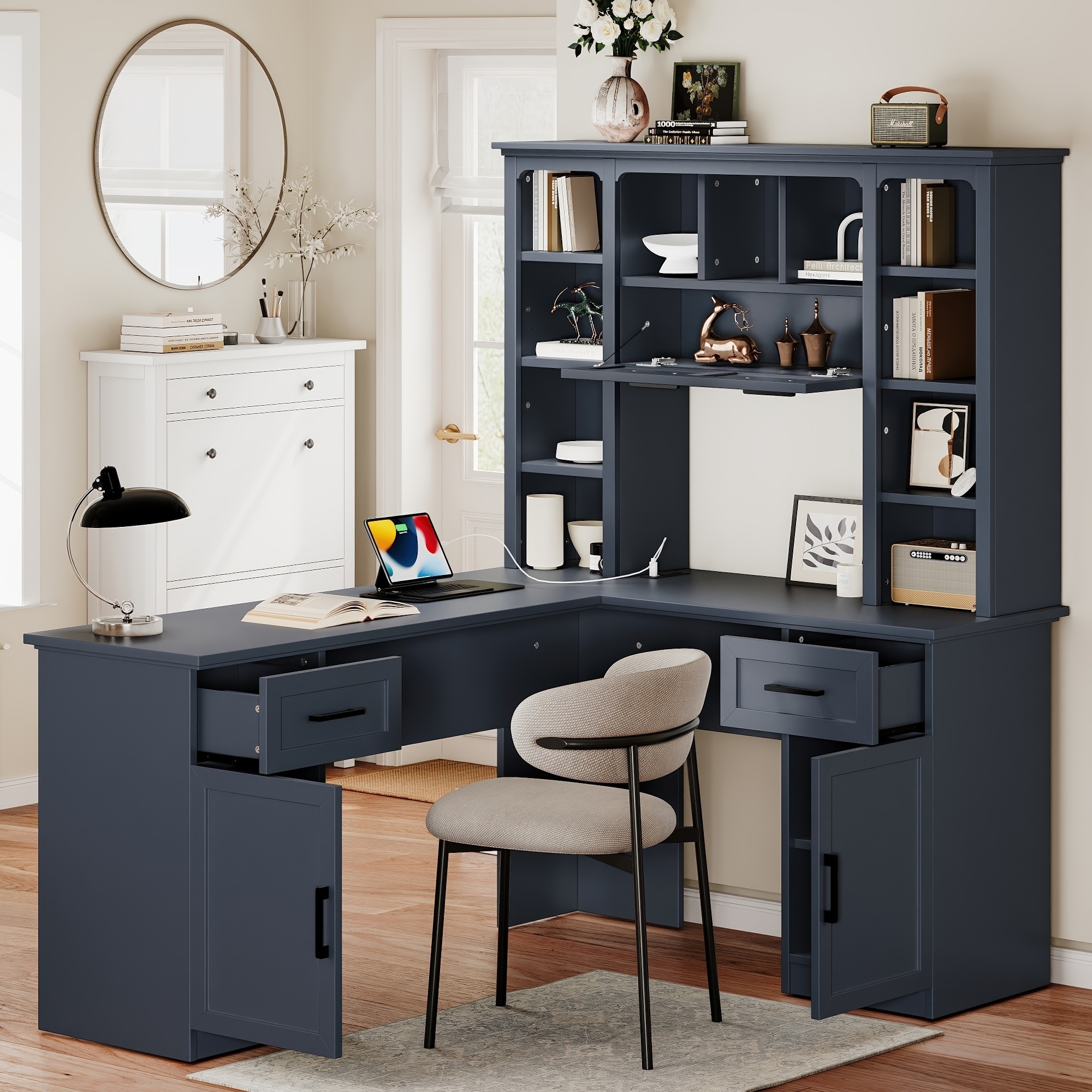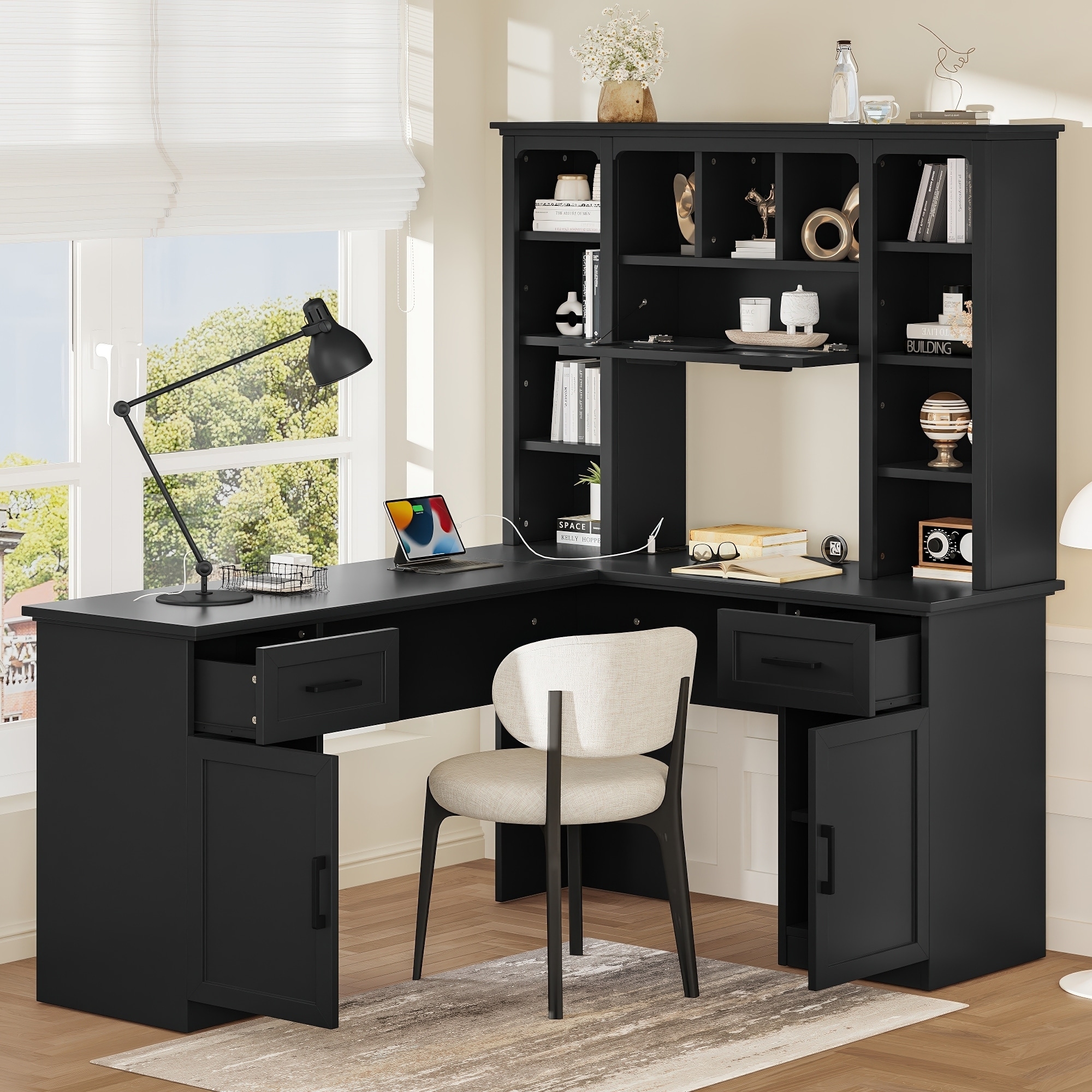 Roomfitters 65" L-Shaped Computer Desk, Power Outlet & Storage Hutch, Modern Corner Desk, 11 Shelves, 2 Cabinets & 2 Units